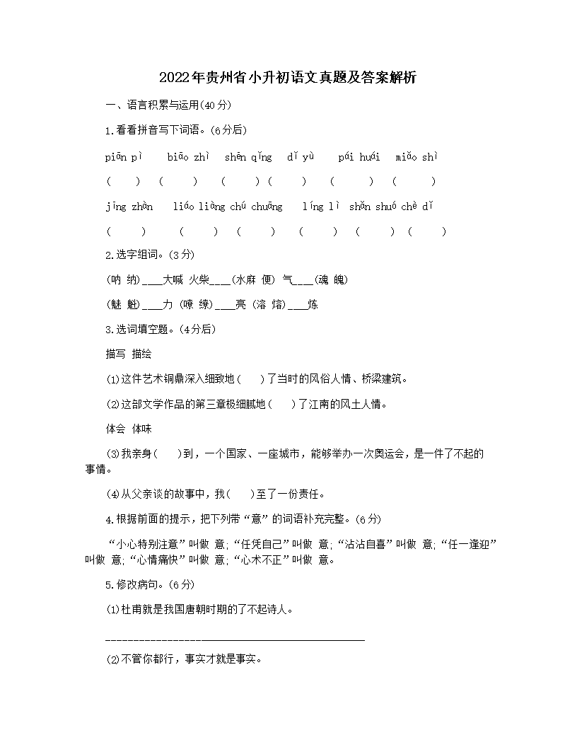 【文档名称】 2022年贵州省小升初语文真题及答案解析(Word版).doc