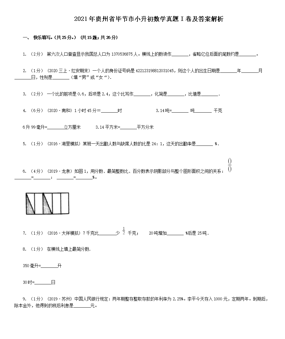 【文档名称】 2021年贵州省毕节市小升初数学真题I卷及答案解析(Word版).doc