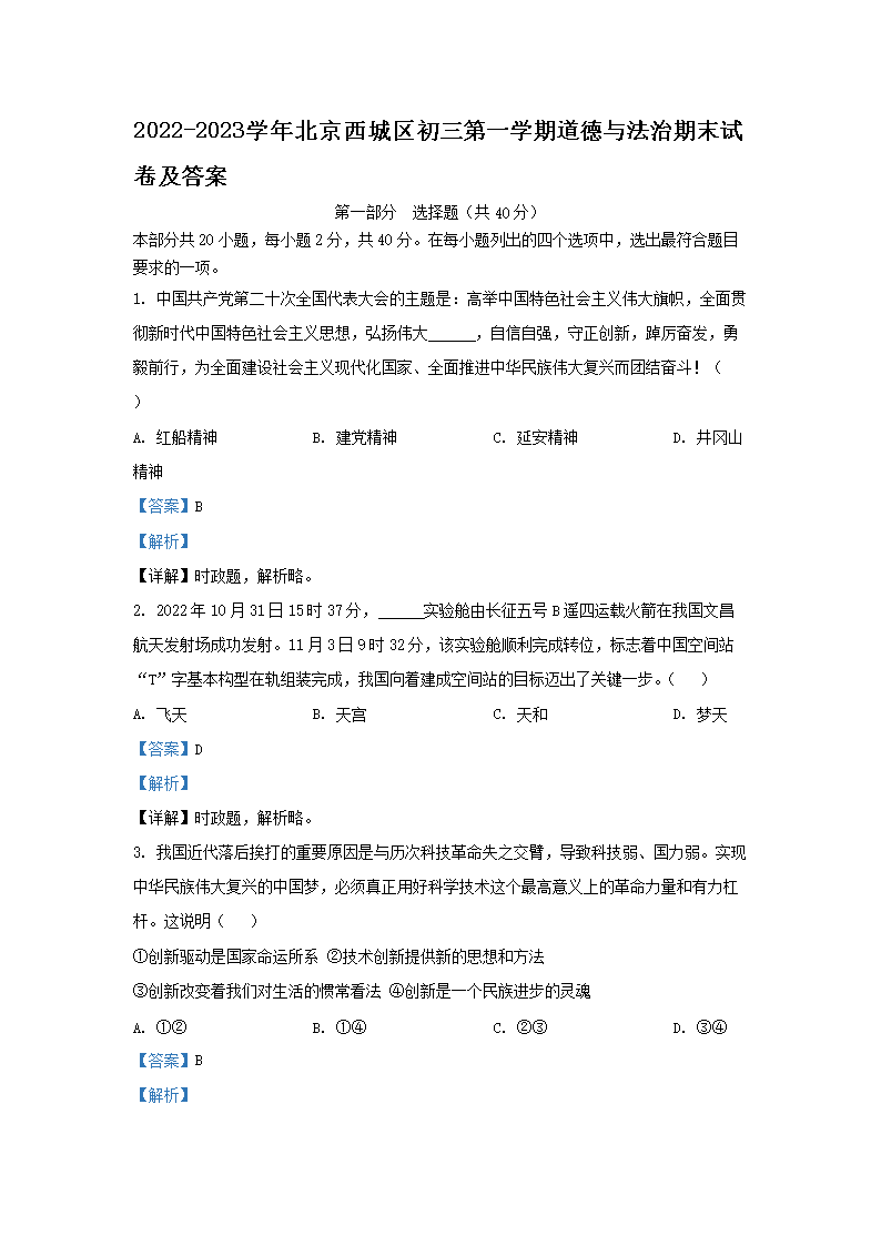 【文档名称】 2022-2023学年北京西城区初三第一学期道德与法治期末试卷及答案(Word版).doc