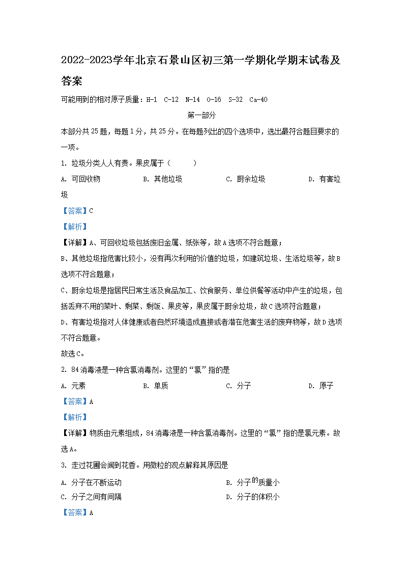 【文档名称】 2022-2023学年北京石景山区初三第一学期化学期末试卷及答案(Word版).doc