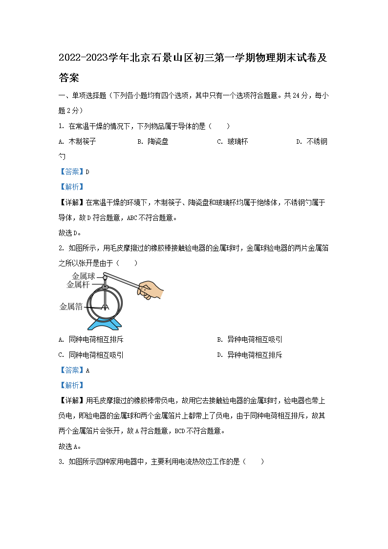 【文档名称】 2022-2023学年北京石景山区初三第一学期物理期末试卷及答案(Word版).doc