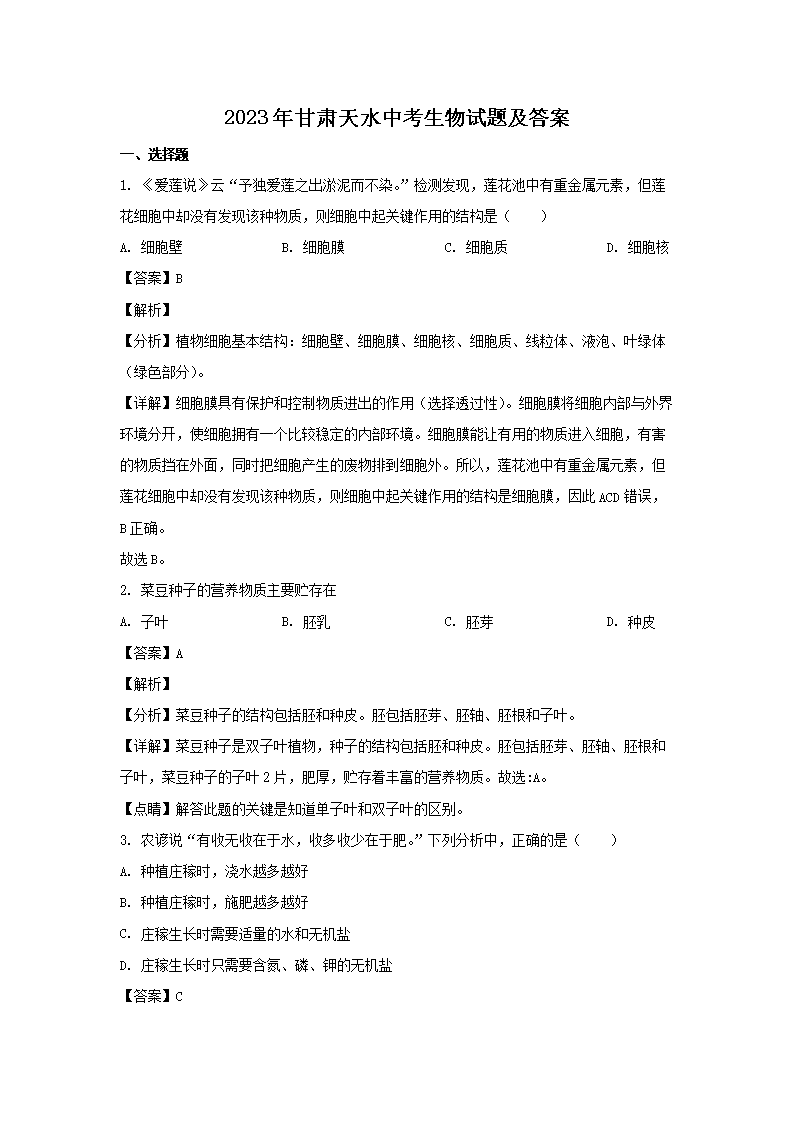 【文档预览】 无忧考网整理发布2023年甘肃天水中考生物试题及答案(Word版),前五页预览如下: