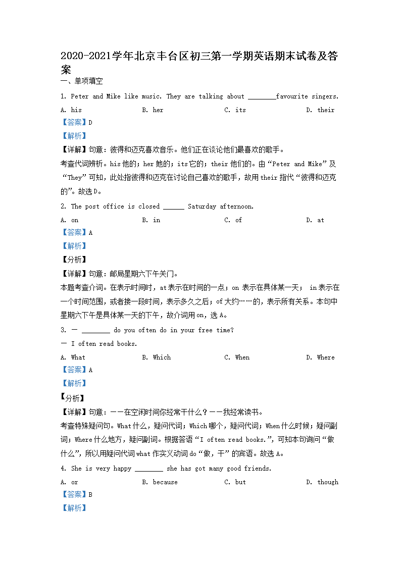 【文档名称】 2020-2021学年北京丰台区初三第一学期英语期末试卷及答案(Word版).doc
