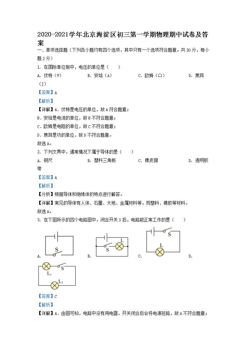 【文档名称】 2020-2021学年北京海淀区初三第一学期物理期中试卷及答案(Word版).doc