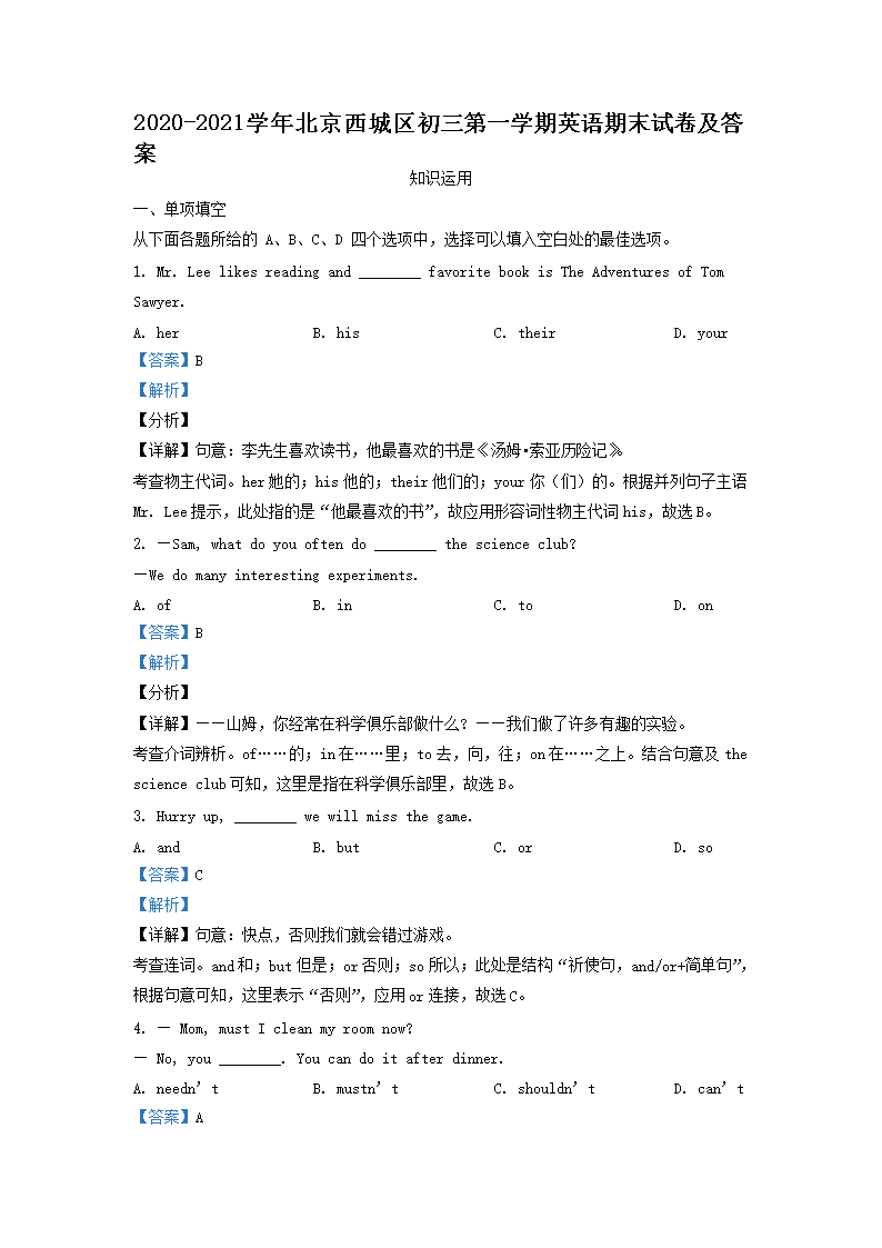 【文档名称】 2020-2021学年北京西城区初三第一学期英语期末试卷及答案(Word版).doc