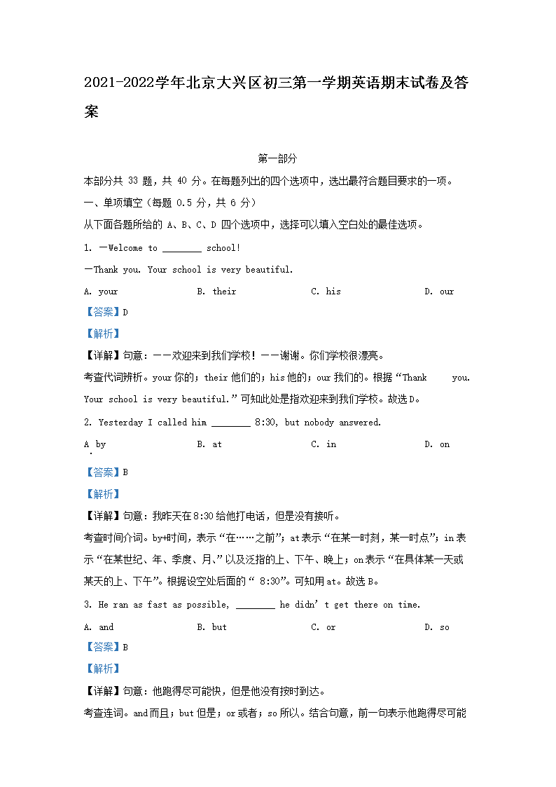 【文档预览】 无忧考网整理发布2021-2022学年北京大兴区初三第一学期英语期末试卷及答案(Word版),前五页预览如下: