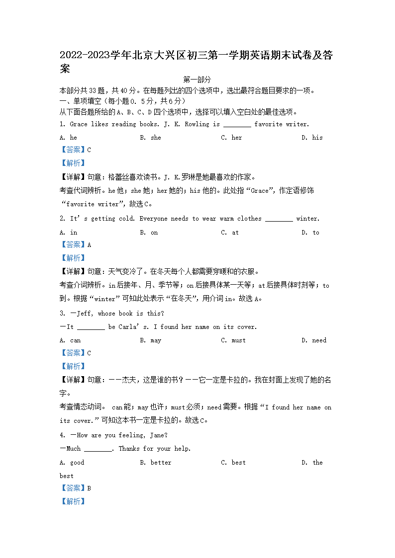 【文档名称】 2022-2023学年北京大兴区初三第一学期英语期末试卷及答案(Word版).doc