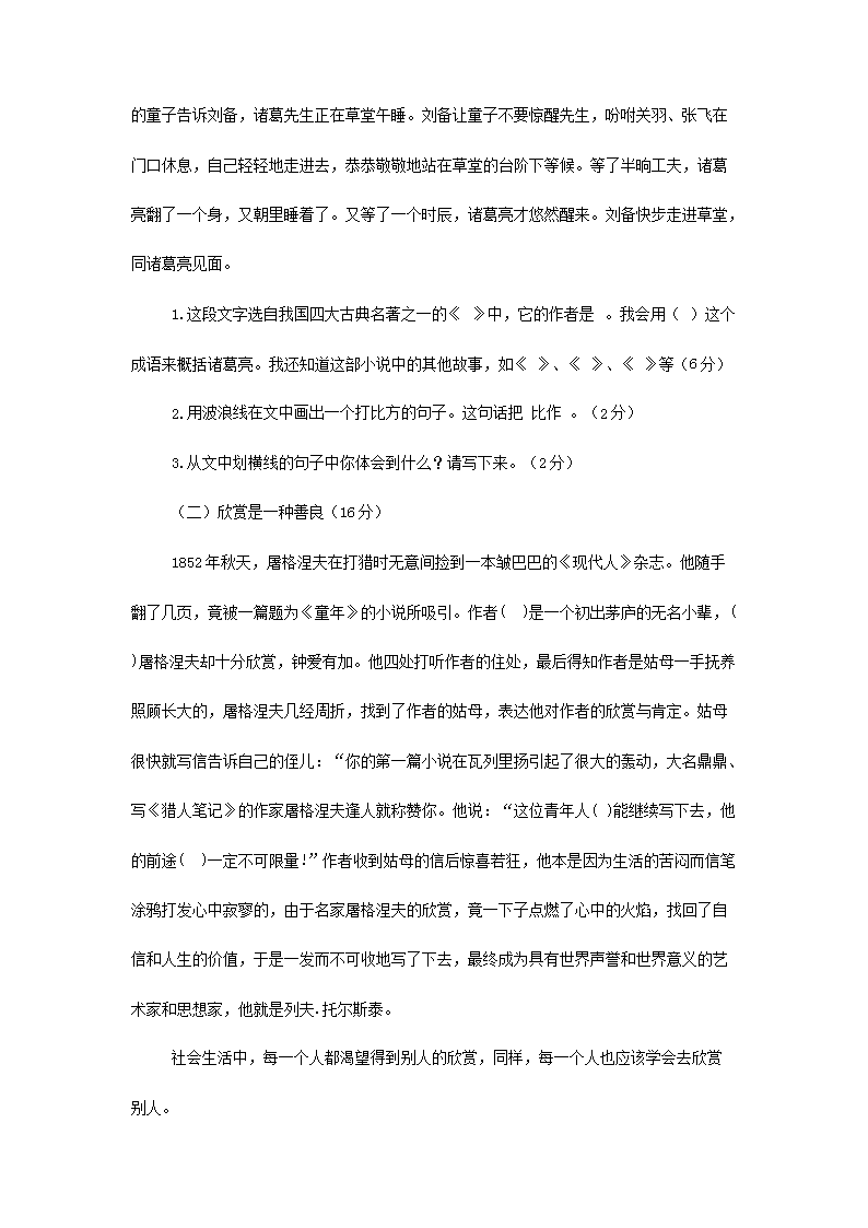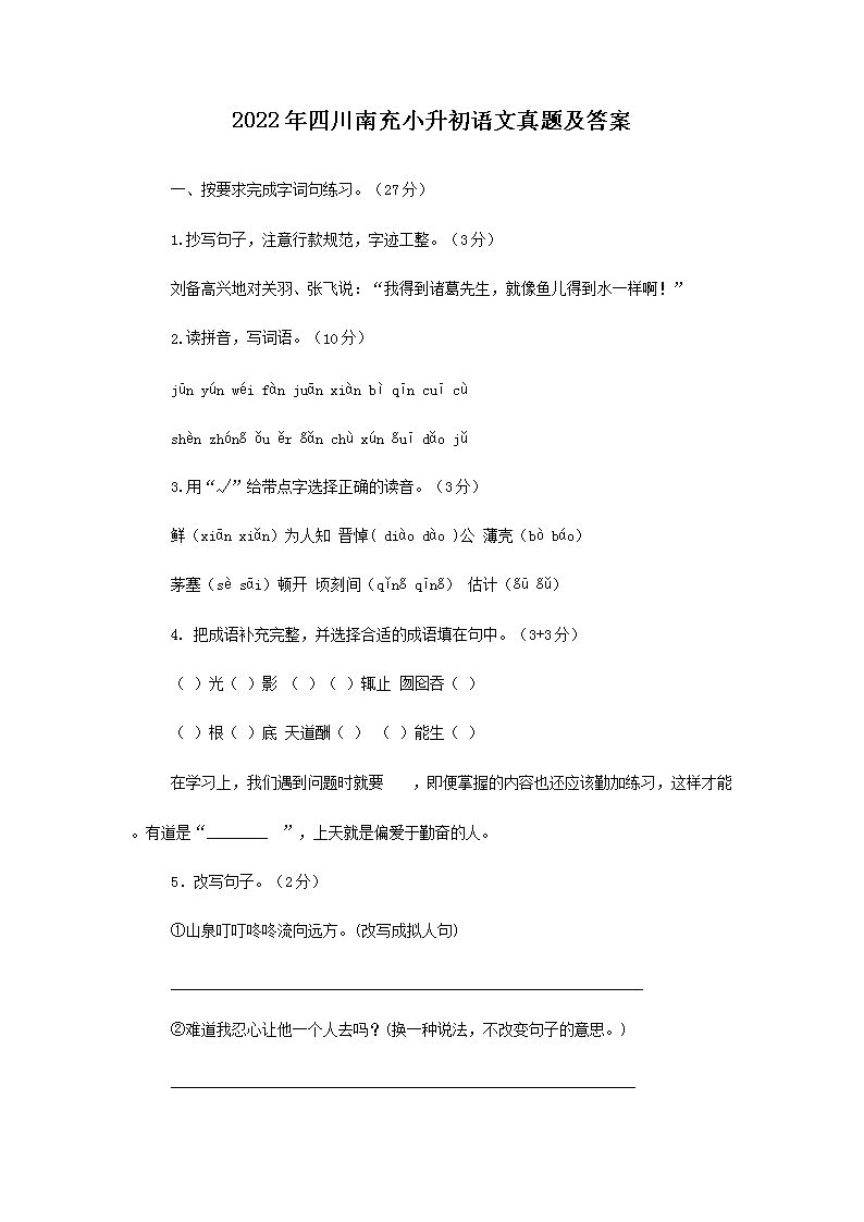 【文档名称】 2022年四川南充小升初语文真题及答案(Word版).doc