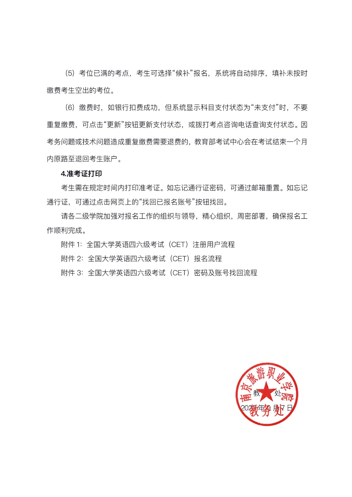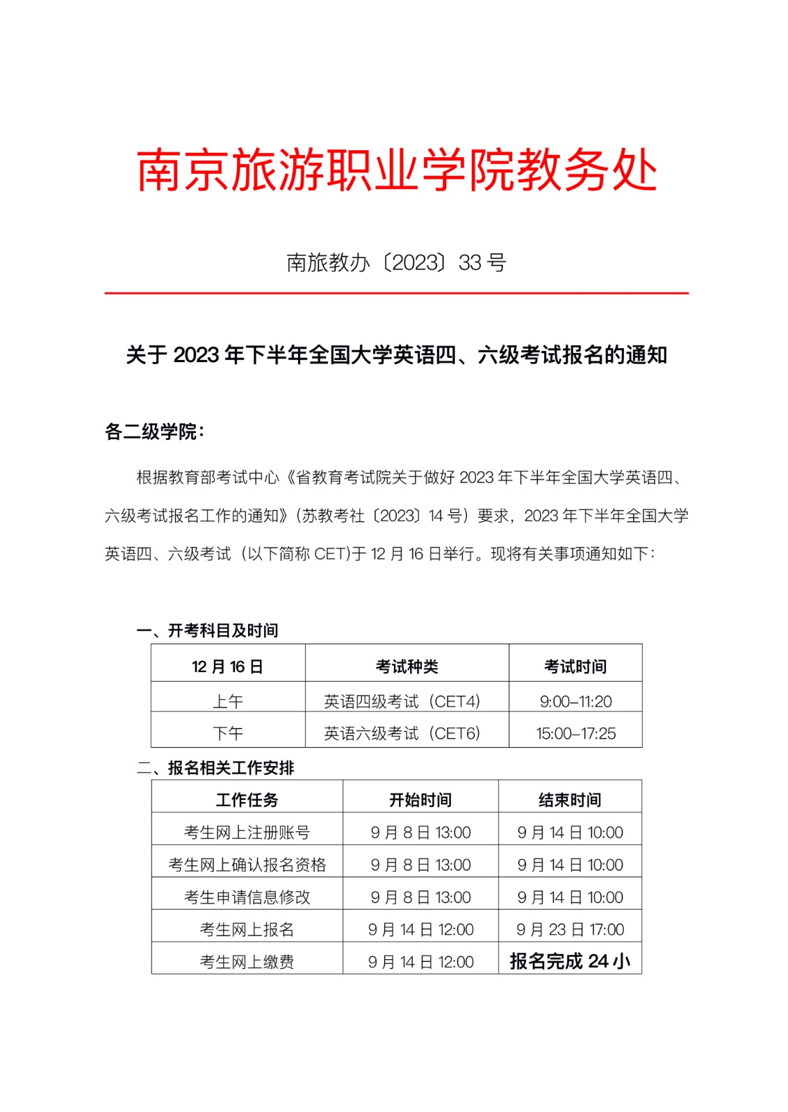 2023年下半年江苏南京旅游职业学院英语四、六级考试报名通知[9月14日起报名]