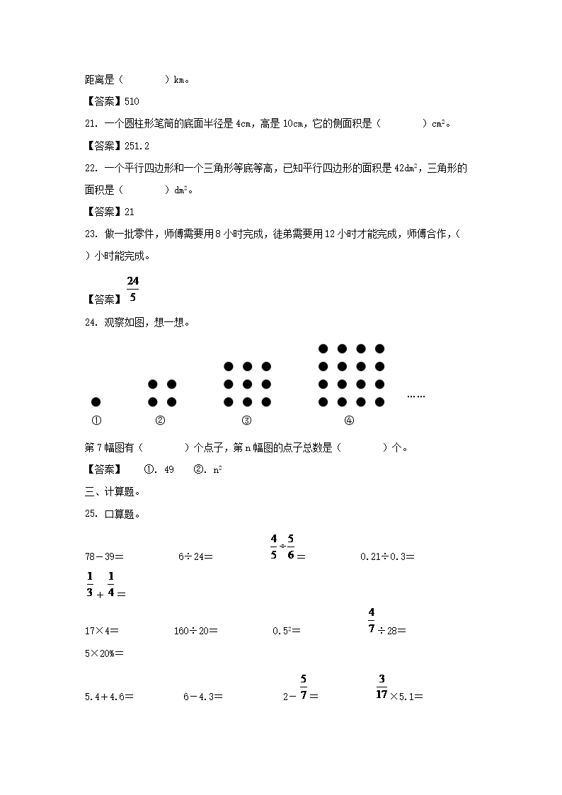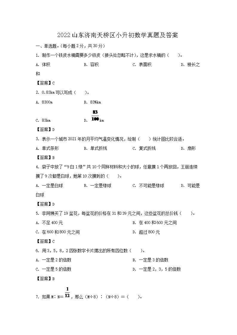 【文档名称】 2022山东济南天桥区小升初数学真题及答案(Word版).doc