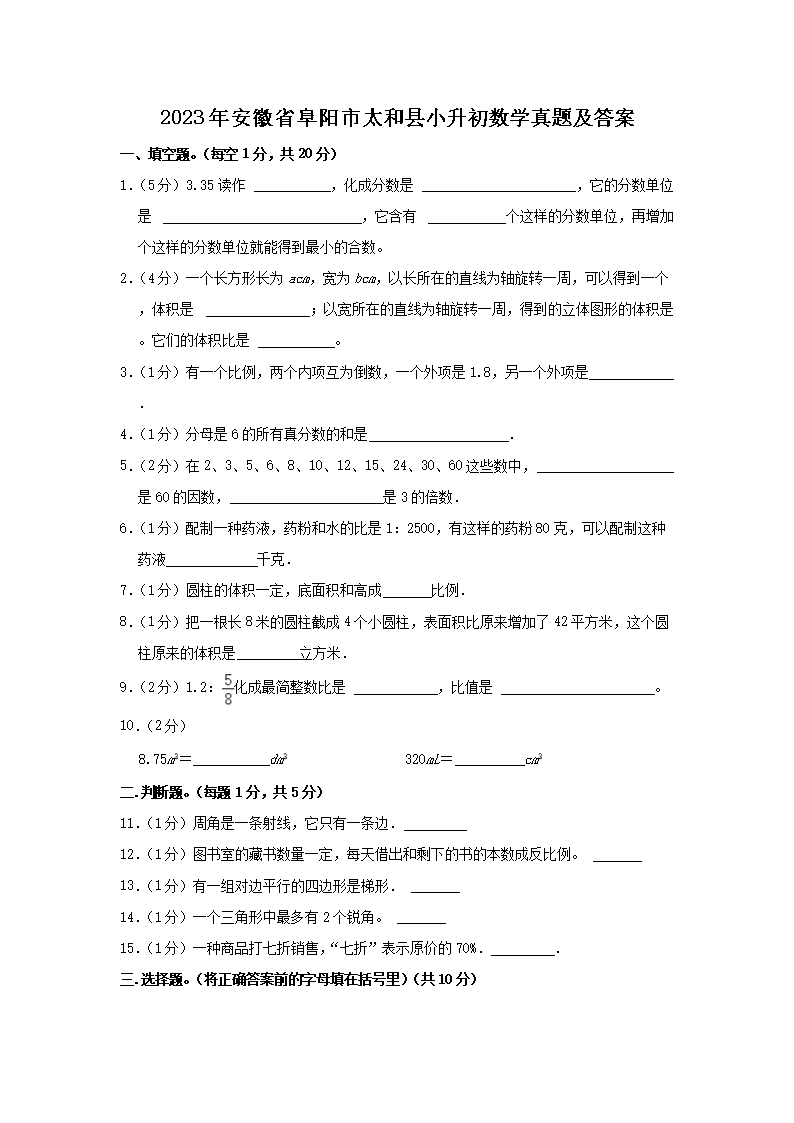 【文档名称】 2023年安徽省阜阳市太和县小升初数学真题及答案(Word版).doc