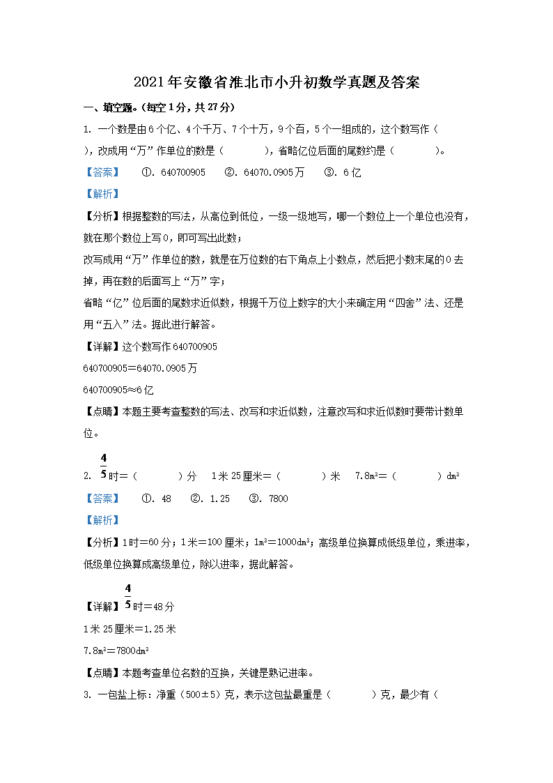 【文档名称】 2021年安徽省淮北市小升初数学真题及答案(Word版).doc