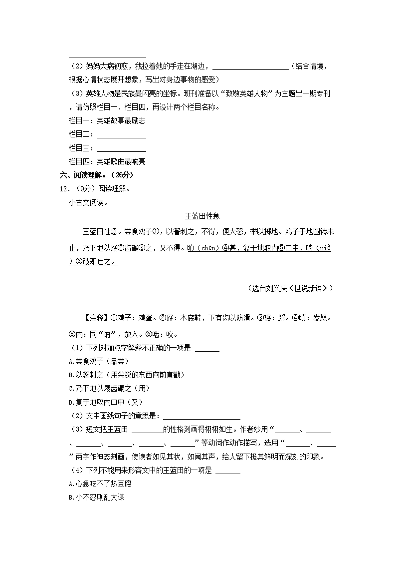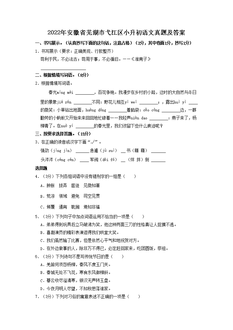 【文档名称】 2022年安徽省芜湖市弋江区小升初语文真题及答案(Word版).doc