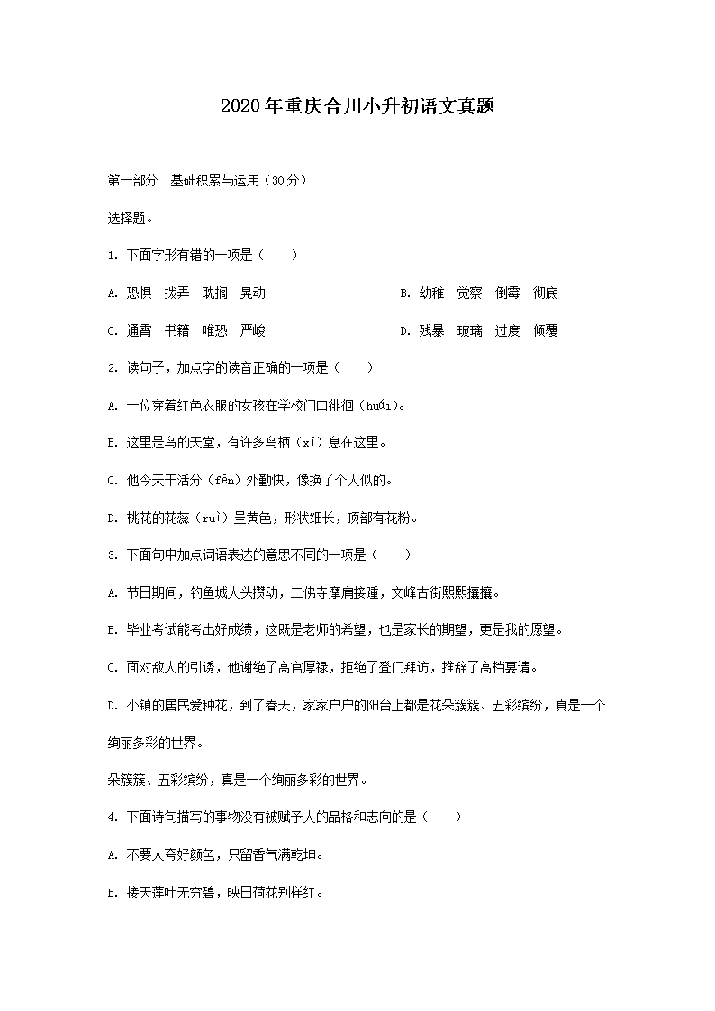 【文档名称】 2020年重庆合川小升初语文真题(Word版).doc