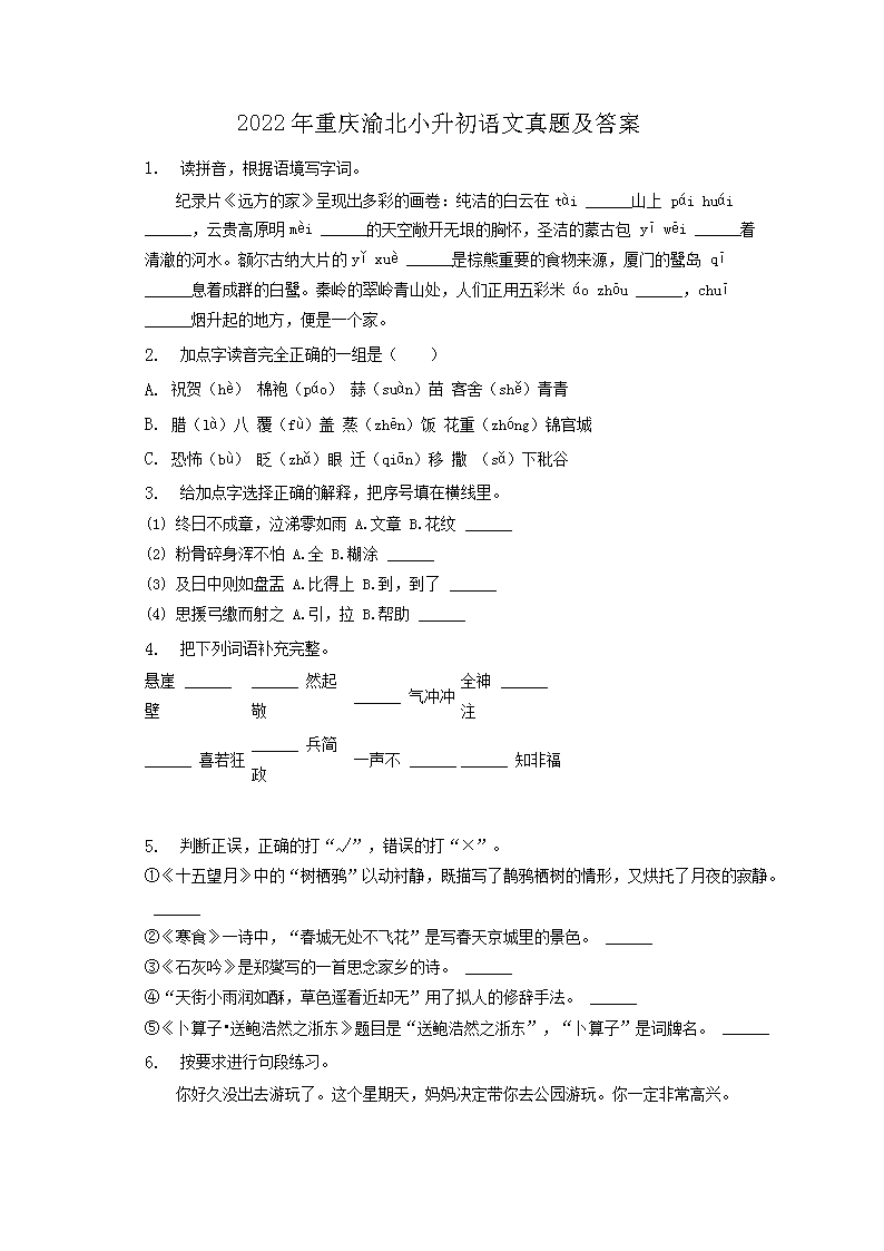 【文档名称】 2022年重庆渝北小升初语文真题及答案(Word版).doc