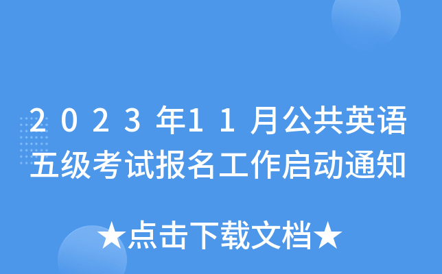 【#公共英语等级考试# #2023年11月公共英语五级考试报名工作启动通知#】©无忧考网从中国教育考试网获悉,2023年11月公共英语五级考试报名工作启动通知已公布,10月17日起报名,具体详情如下: