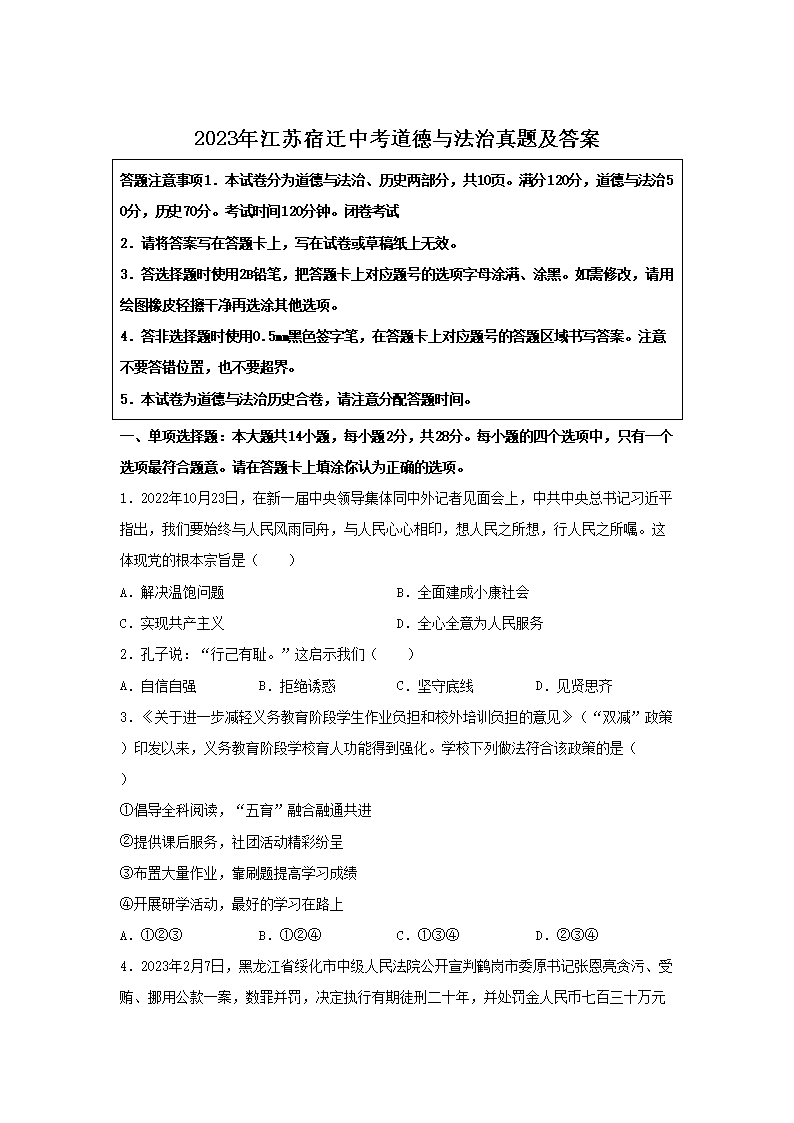 【文档名称】 2023年江苏宿迁中考道德与法治真题及答案(Word版).doc