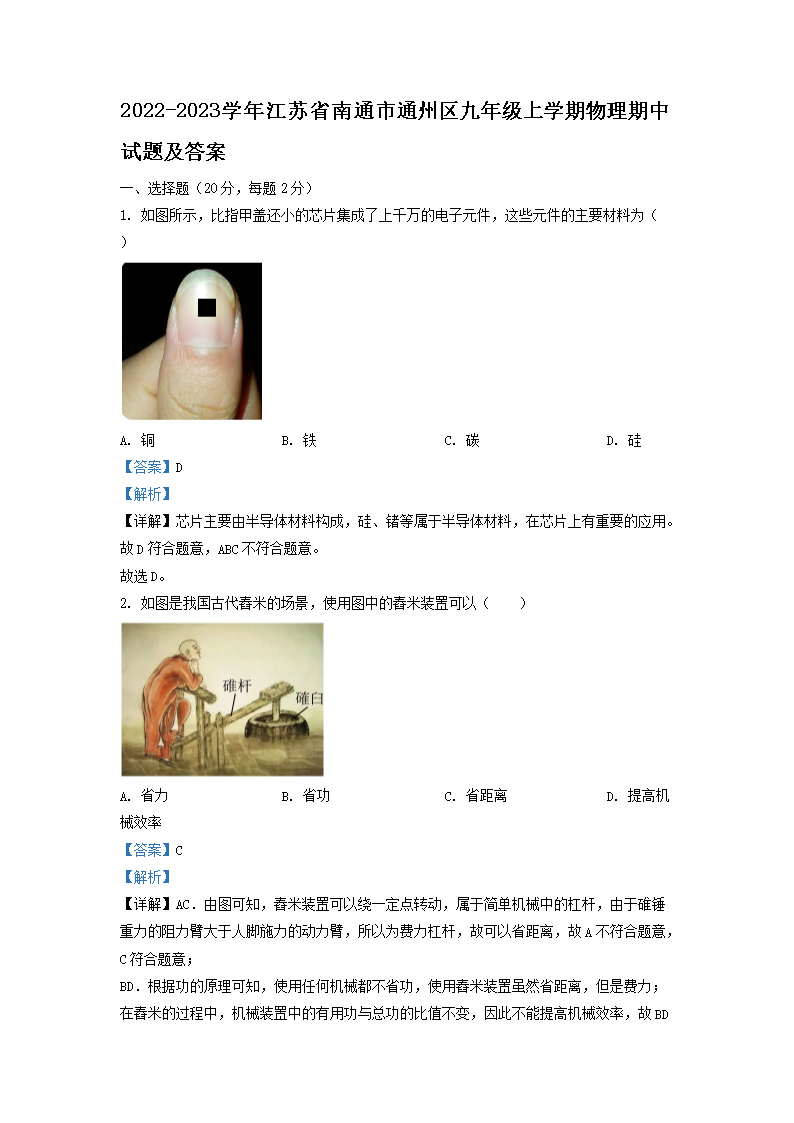 【文档名称】 2022-2023学年江苏省南通市通州区九年级上学期物理期中试题及答案(Word版).doc