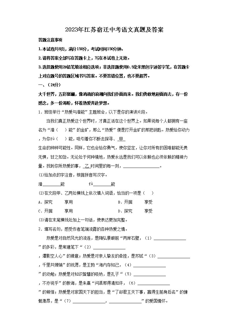 【文档名称】 2023年江苏宿迁中考语文真题及答案(Word版).doc