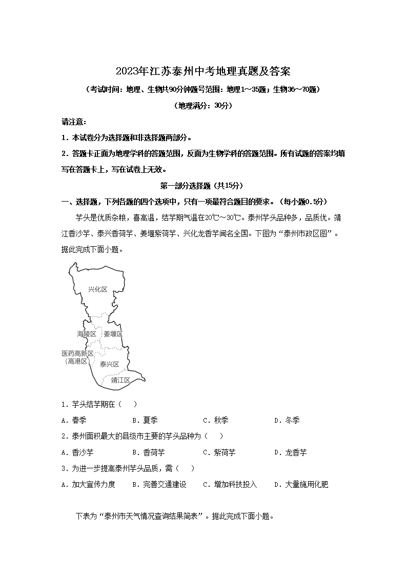 【文档名称】 2023年江苏泰州中考地理真题及答案(Word版).doc