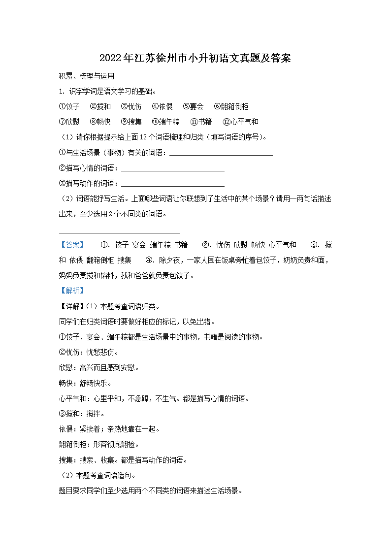 【文档名称】 2022年江苏徐州市小升初语文真题及答案(Word版).doc