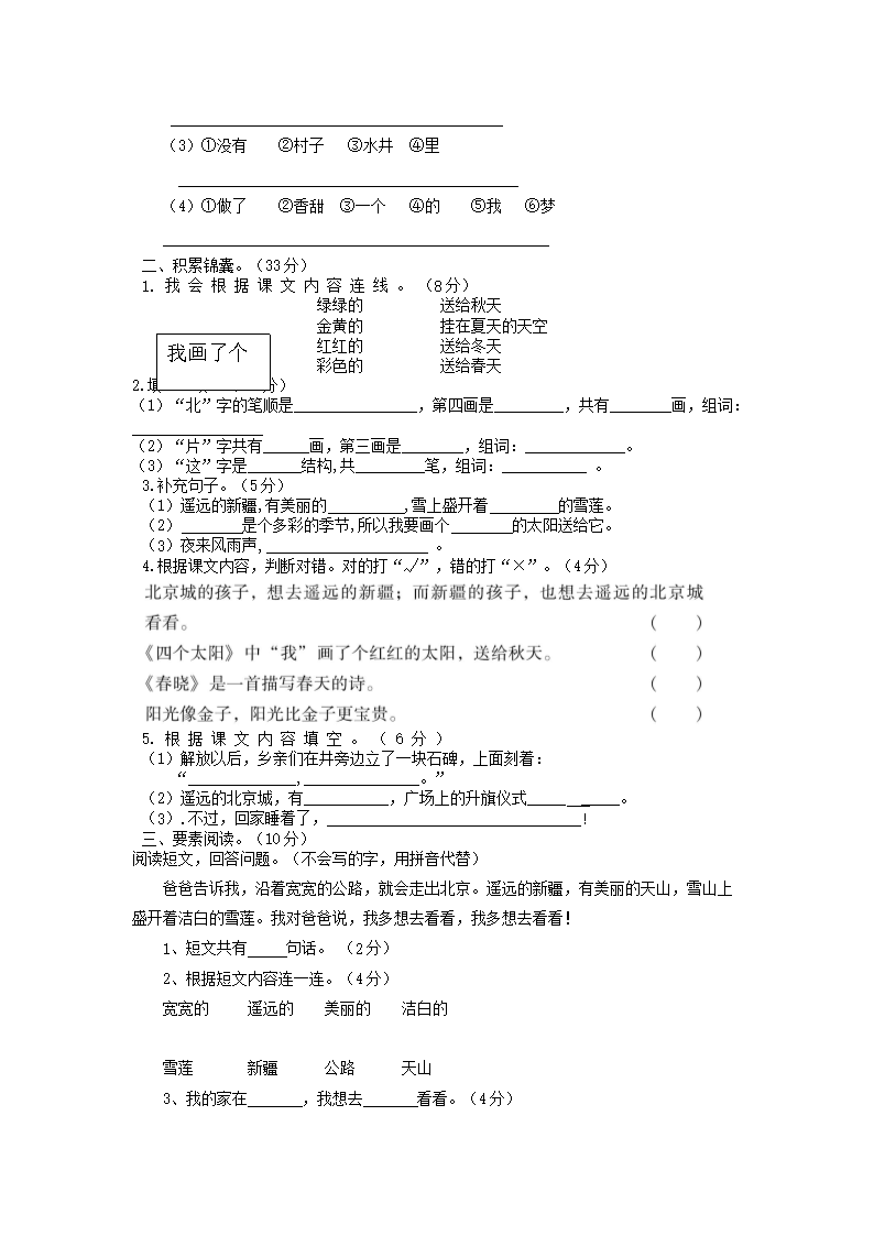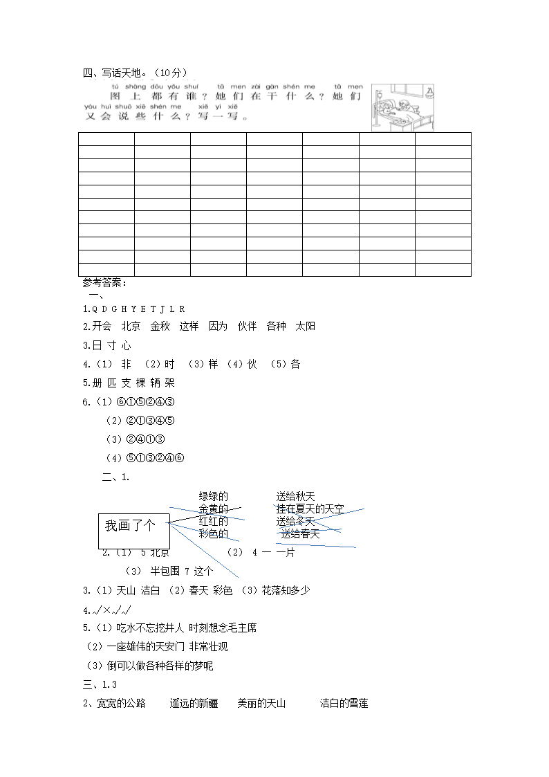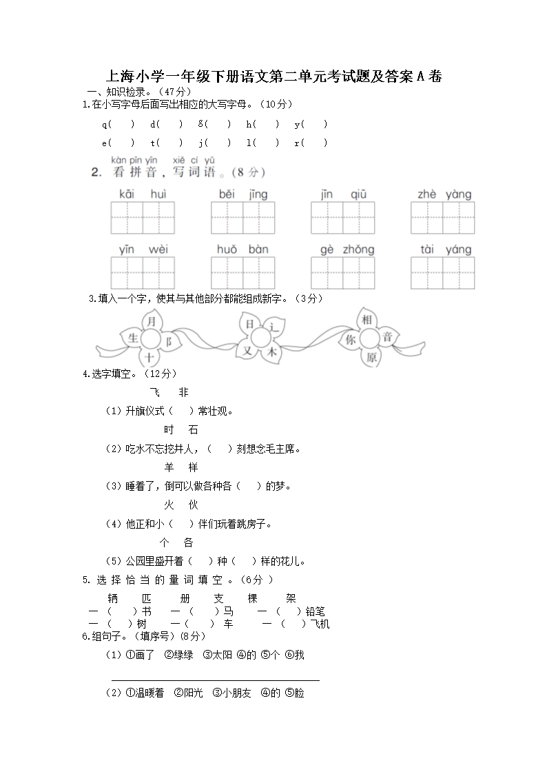 【文档名称】 上海小学一年级下册语文第二单元考试题及答案A卷(Word版).doc