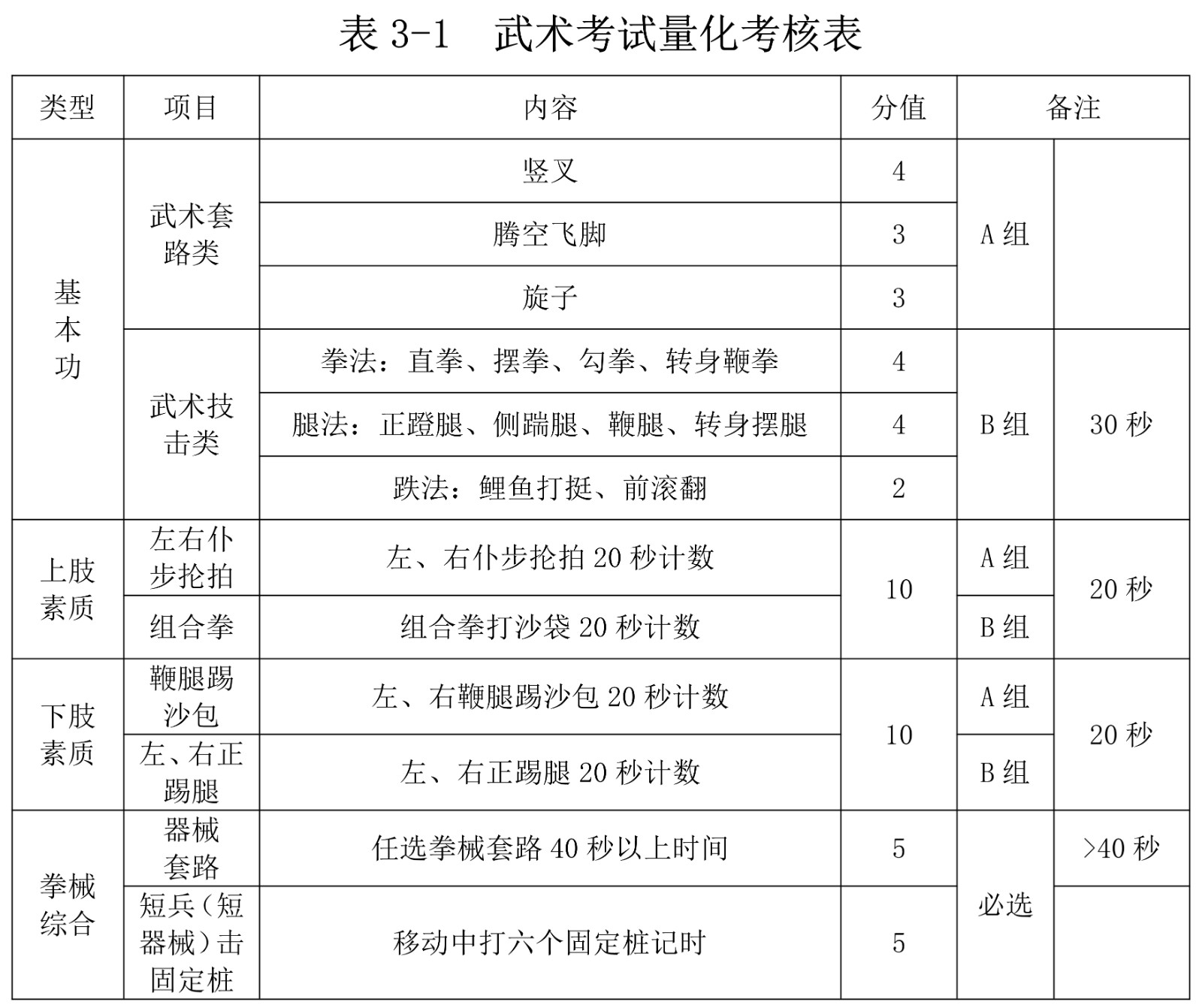 武术考试项目的主要内容为基本功、上肢素质、下肢素质和拳械综合,各项内容的分值各为10分,四项最后得分相加为武术专项的最后得分(单项最后得分=单项量化得分×单项技评系数值)。其中前三项内容都有A、B两组,任选一组动作测试,只能选择一次,第四项为必选项。(见:表3-1)