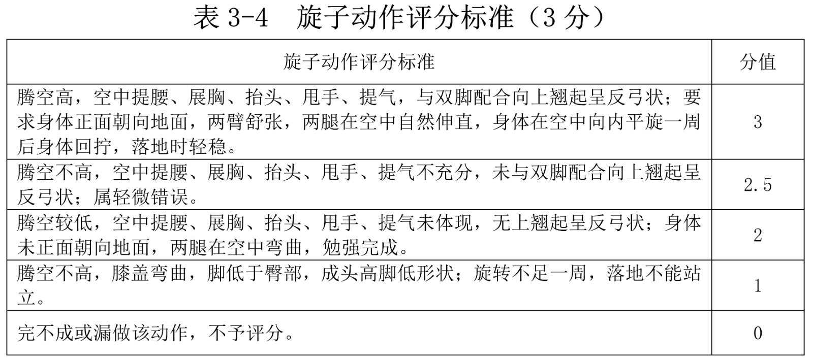 c.动作完成的前提下,对动作进行技评打分。技评针对每个完成的动作进行评定,评分标准见(表3-9-2)。