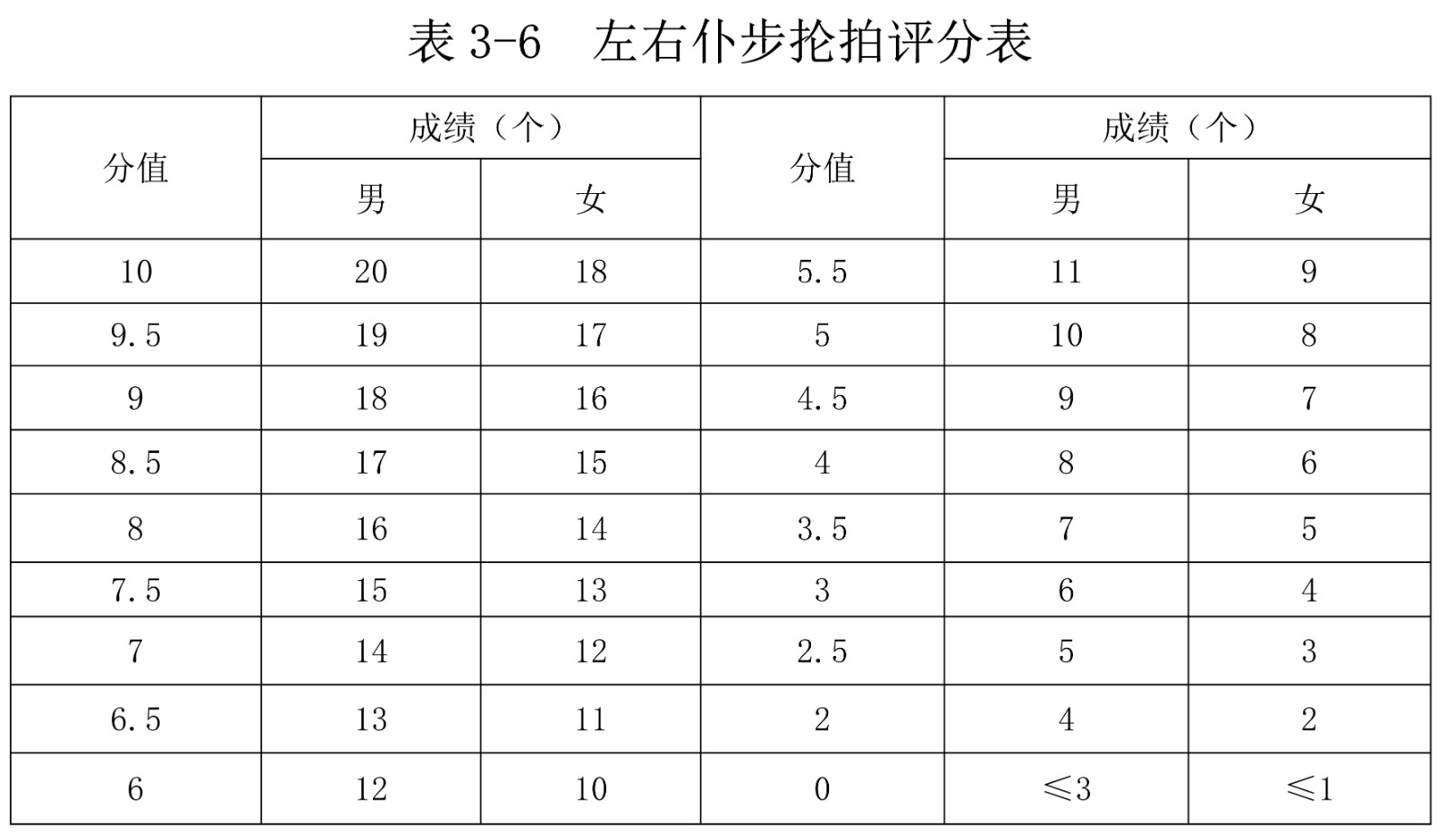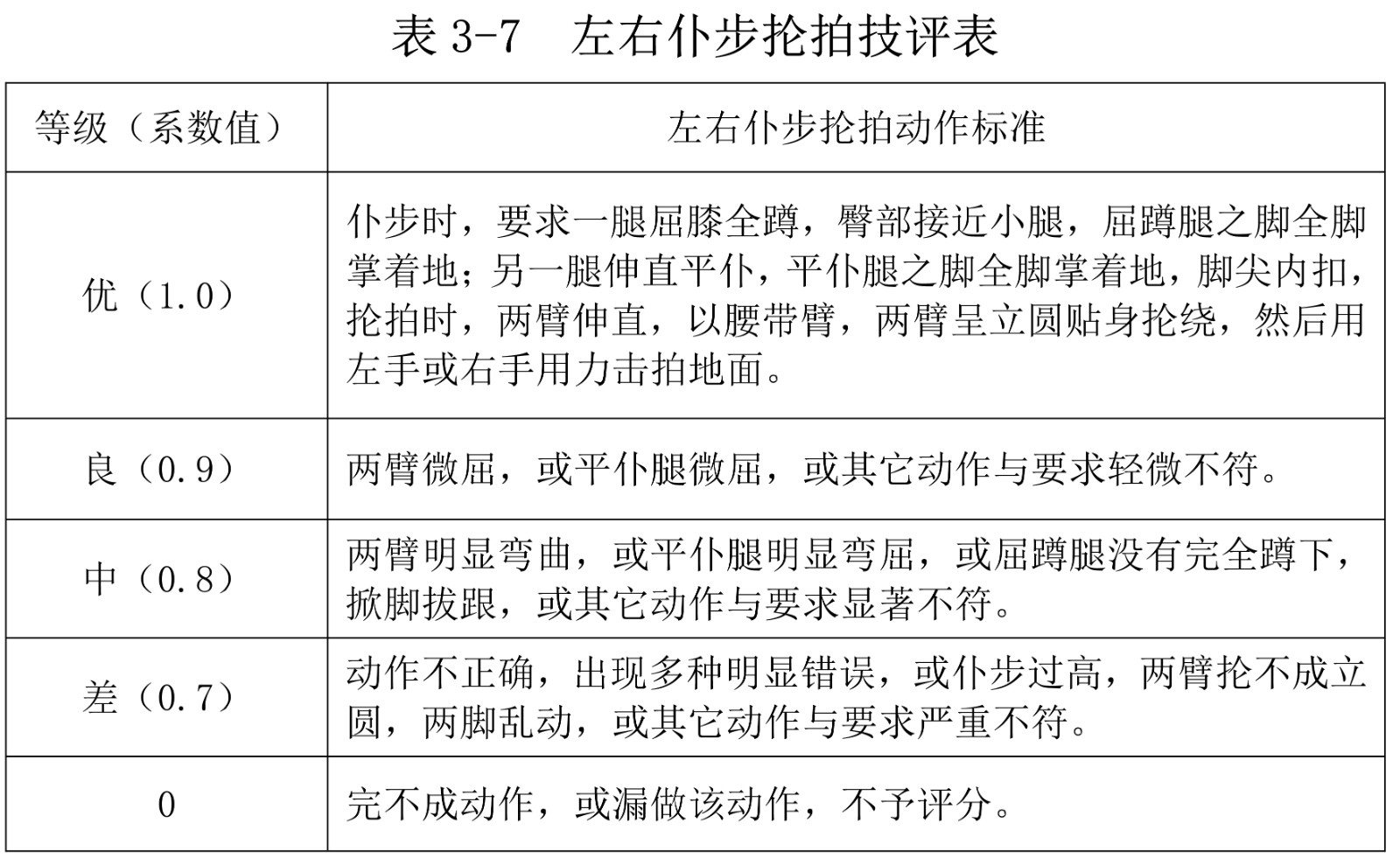 考试方法:考生在20秒规定时间内,连续左、右仆步抡拍,每人测试一次。考评员对考生在规定时间内左、右仆步抡拍的次数和动作质量进行计数和技评,计数和技评同时进行,得分标准见表3-6、表3-7。计数部分:考评员对考生在规定时间内仆步抡拍的次数进行计数,凡岀现不符合要求时按照动作规格进行扣分。