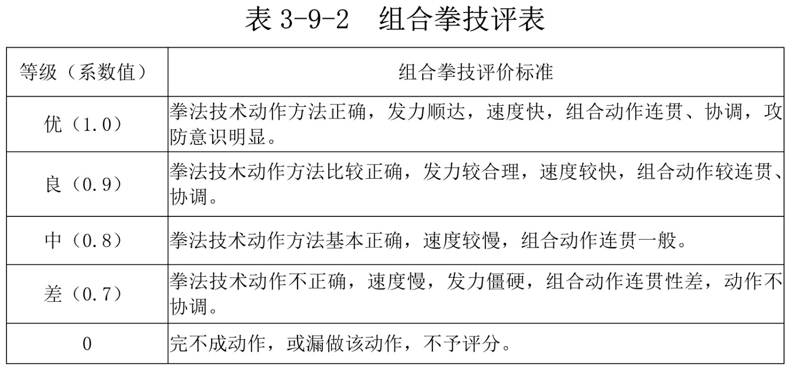 评分标准:考评员参照拳腿跌组合评分细则,独立对考生的动作规格、劲力协调、攻防意识等方面进行综合评定。釆用10分制评分,所打分数至多可到小数点后1位,每漏做一种技术动作扣1分。