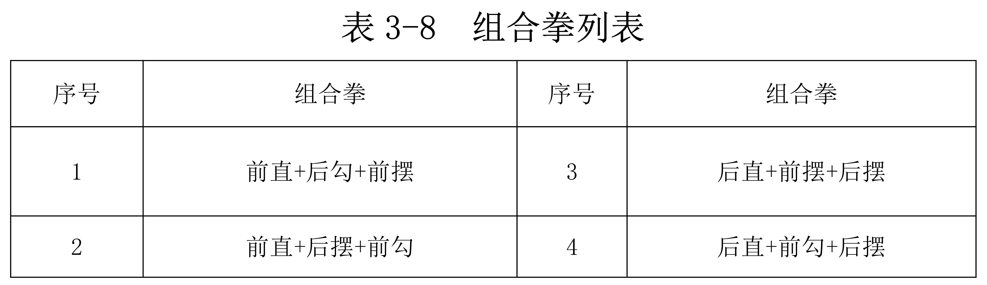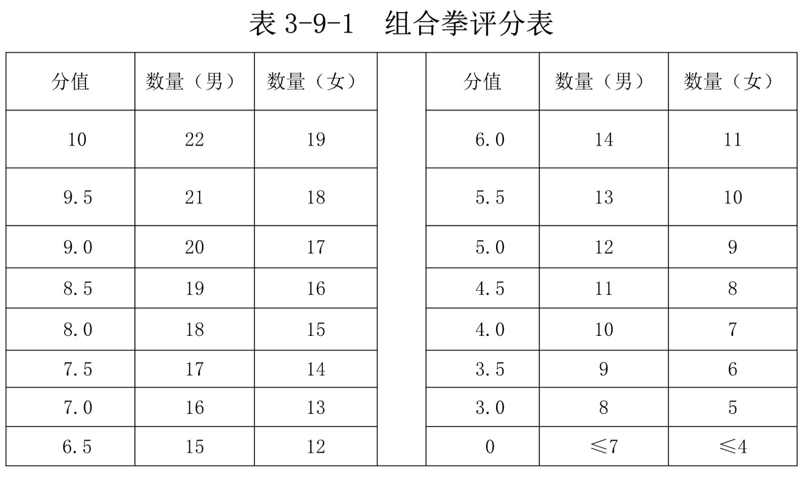 a.考试方法:考生从下列备选的组合拳(表3-8)中选择其中1组进行考试。考生对考评员指定的沙包进行击打,时间为20秒。要求考生击打沙包时技术动作规范、协调,节奏感强,出拳准确有力,每击打一组后需后撤一步再进行下一组的击打,符合考试要求的拳法组合,方被视为有效。对考生在规定时间内完成的有效组数进行计数,无效拳法组合不予计数,评分标准见(表3-9-1)。