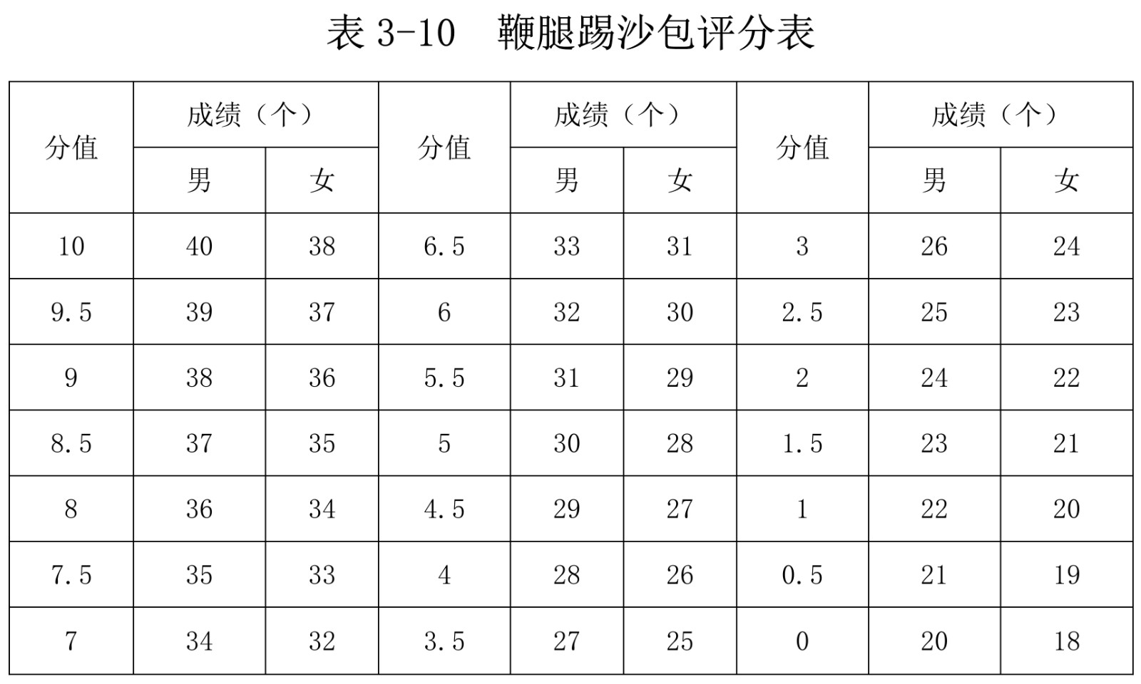计数部分:考评员对考生在规定时间内踢打的次数进行计数,凡岀现髙度不符合要求时,不计次数。评分标准见(表3-10)。