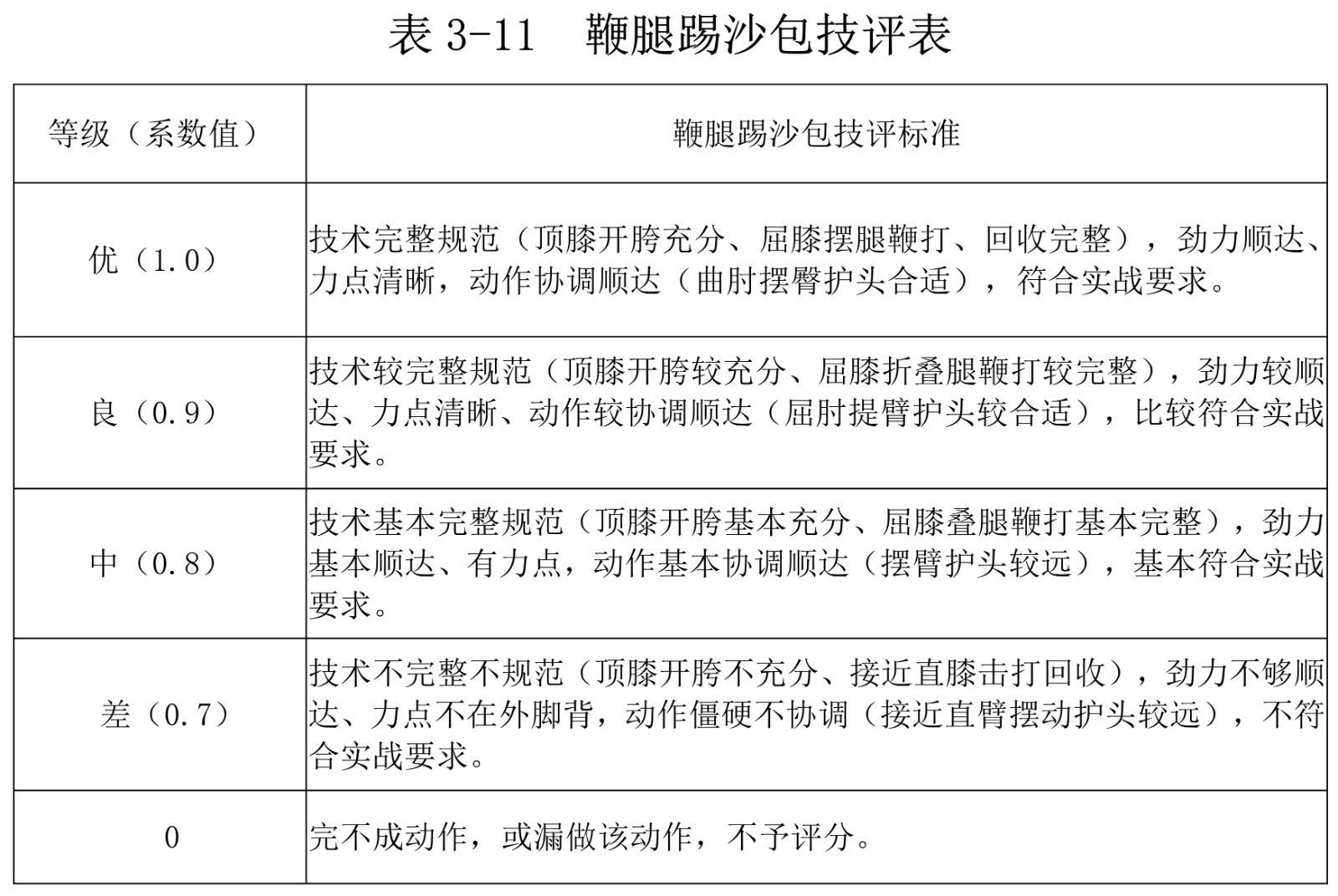 b.技评部分:考评员参照鞭腿踢沙包技评表细则,独立对考生的动作规范、力点清晰、协调顺达是否符合实战要求等方面进行综合评定。技术评定标准见(表3-11)。