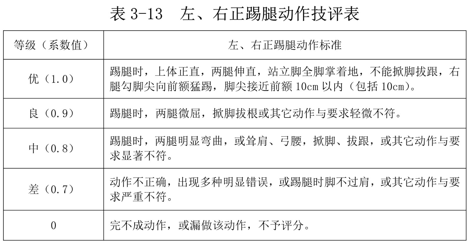 c.技评部分:考评员参照正踢腿技评表细则,独立对考生的动作规范、力点清晰、协调顺达等方面进行综合评定。技术评定标准见(表3-13)。
