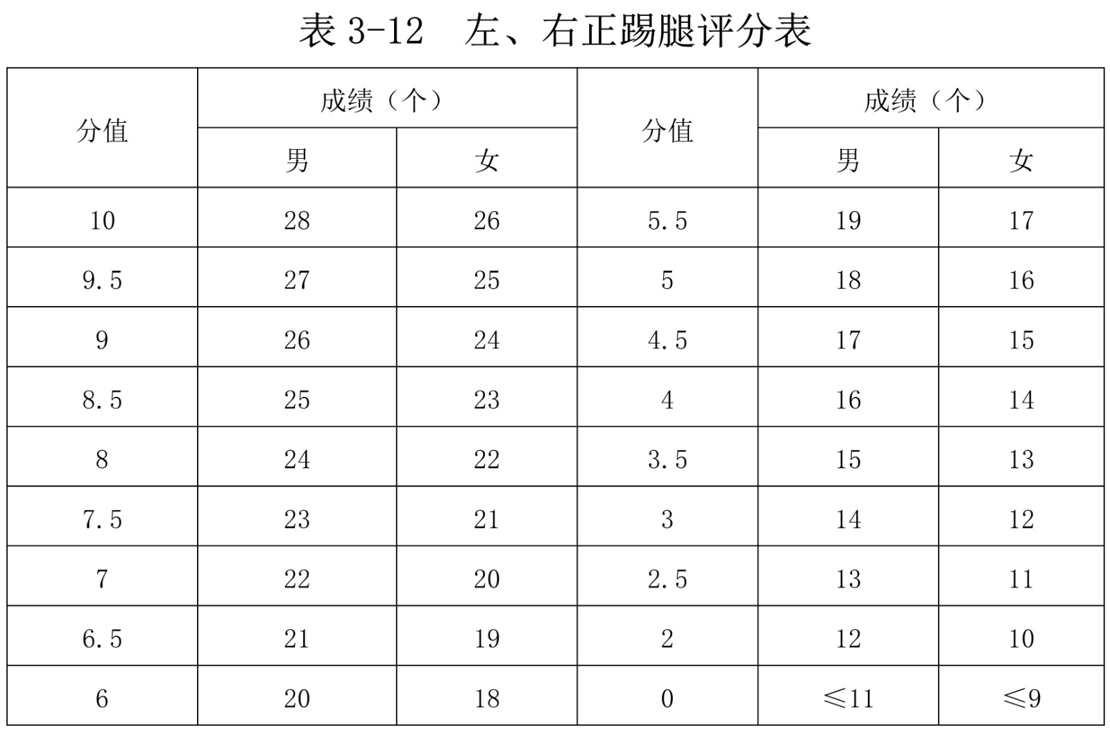 b.计数部分:考评员对考生在规定时间内踢的次数进行计数,凡岀现不符合要求时,不计次数。评分标准见(表3-12)。
