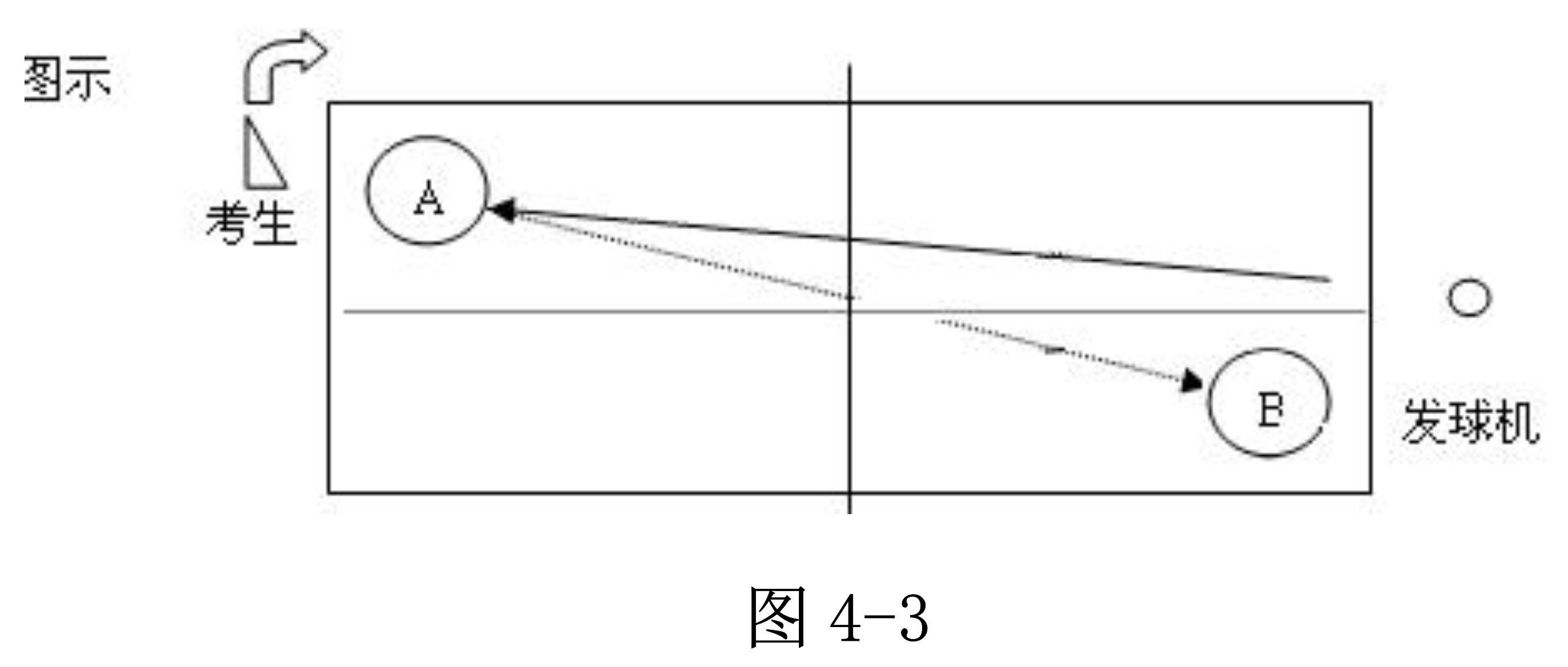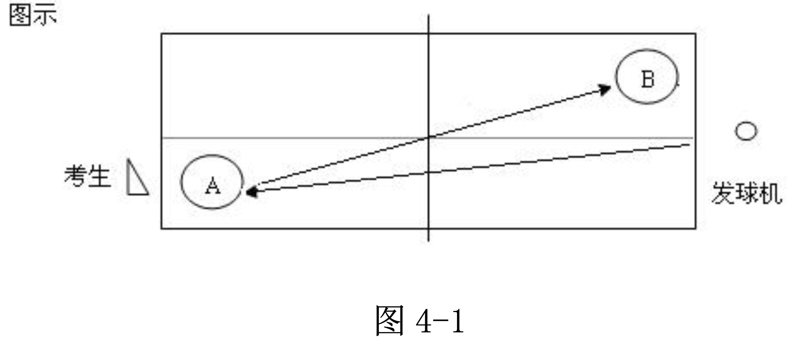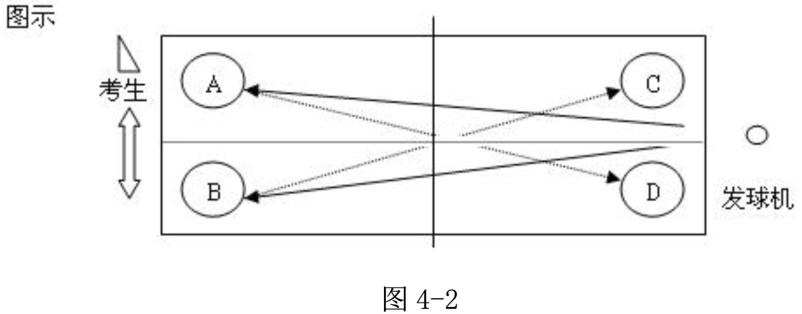 A.考生站于本方台区从反手位击球,然后利用步法的移动到正手位击球,依次类推对发球机发出的球进行回击。身体离球台不超过50cm将发至A区的球回至D区,将发至B区的球回至C区。以防止发球机对球的干扰。