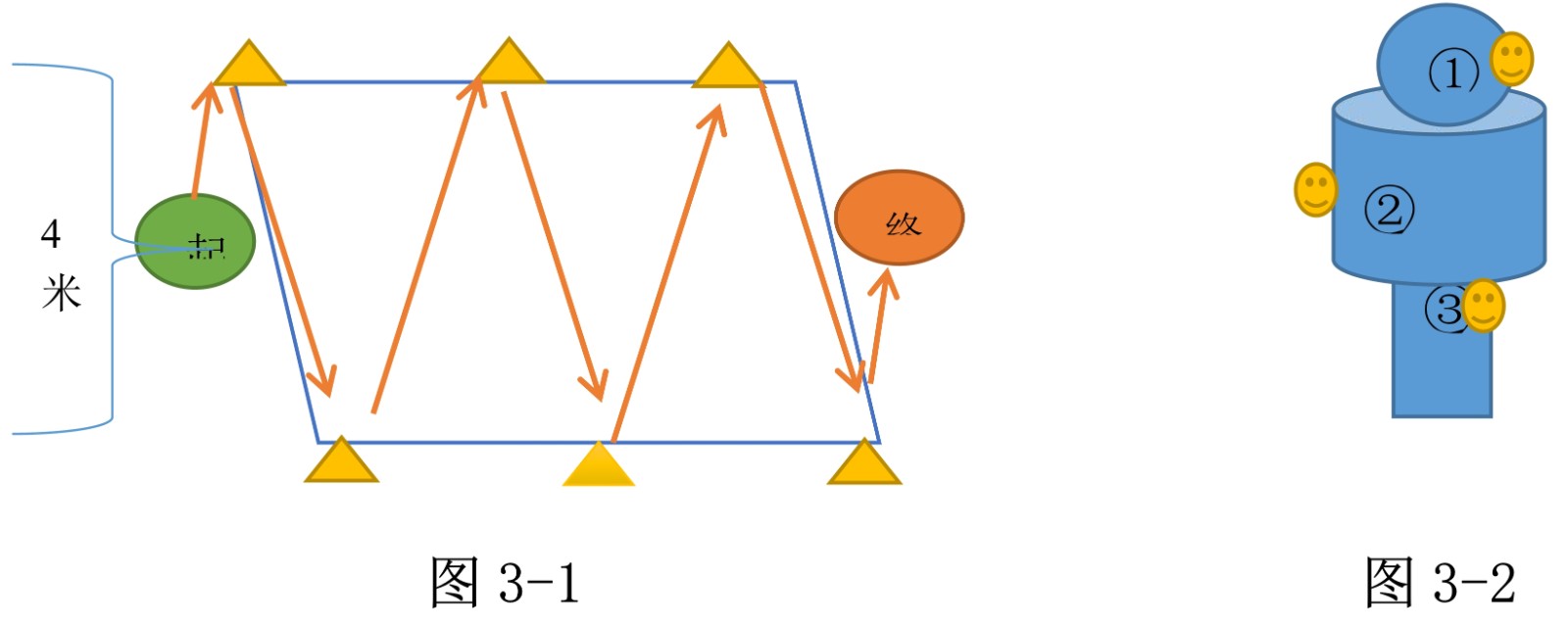 b.考生在起点圈内做好准备后,听口令开始沿箭头分别击打六个固定桩,打完后、任意一只脚踏进终点圈停止计时(图3-1)。(图3-2)中标示的①②③为打击的三个位置,打击顺序不限。