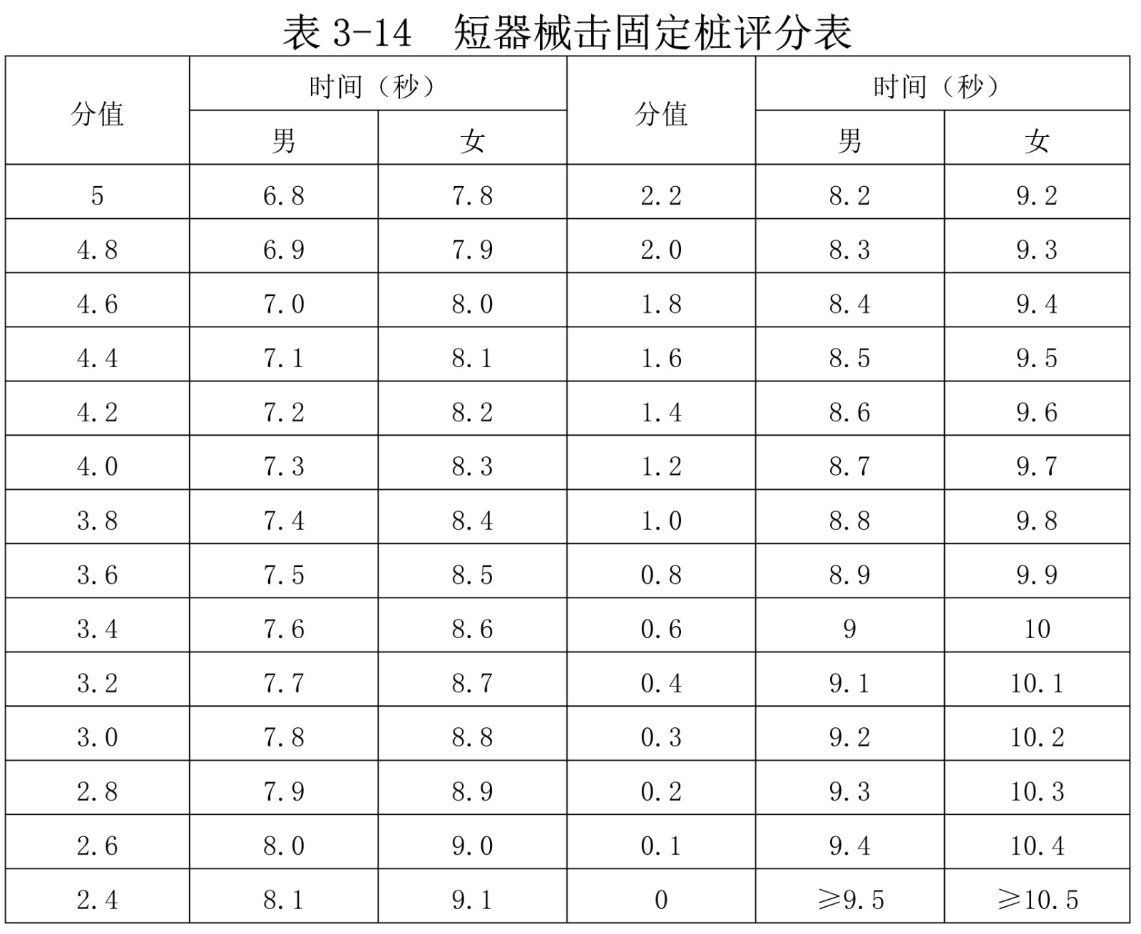 a.用器械(短兵)全长90cm,打六个固定桩(桩高170cm、直径40cm)。固定桩分成两排,一排三个,两排距离4米,每两个相邻桩距离2米,成“Z”字形排列。每个桩分别打头、躯干、大腿三个固定点。考生站在出发台前,前脚踏住计时启动器,准备好后听口令自己启动计时器,按顺序打完三个桩的固定点后,自己停计时器,回到出发台。所用时间换算成分数就是考生的最终分数,每个考生考2次,取成绩。考生打桩所用的移动方法不限,漏掉任意一个点扣1分,依次递减,直至清零,得分标准和考试方法见(表3-14)和(图3-1)、(图3-2)。