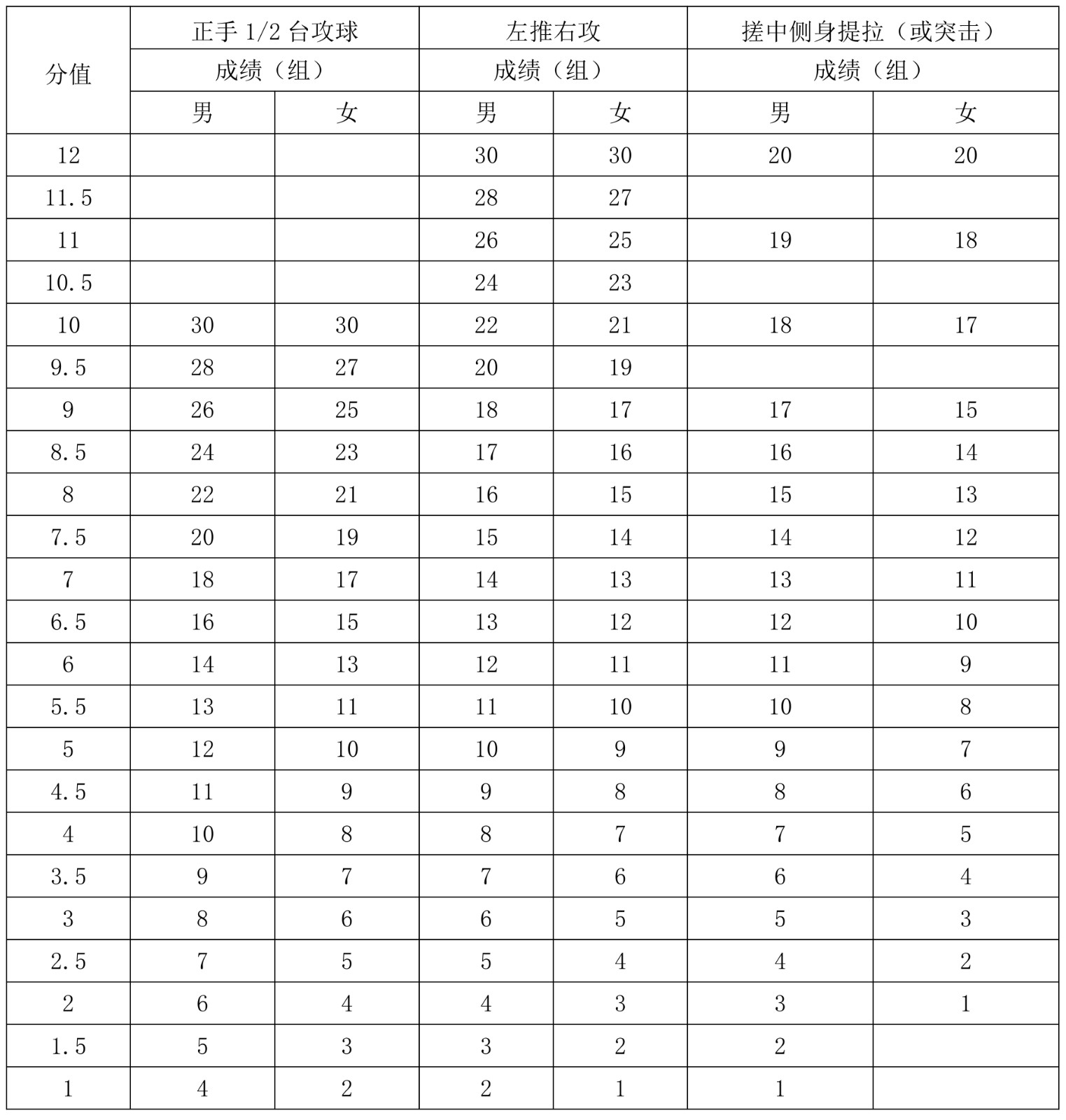 ①专项技术(34分),其中:正手1/2台攻球(10分)、左推右攻或两面攻(12分)、搓中侧身提拉(或突击)(12分)。