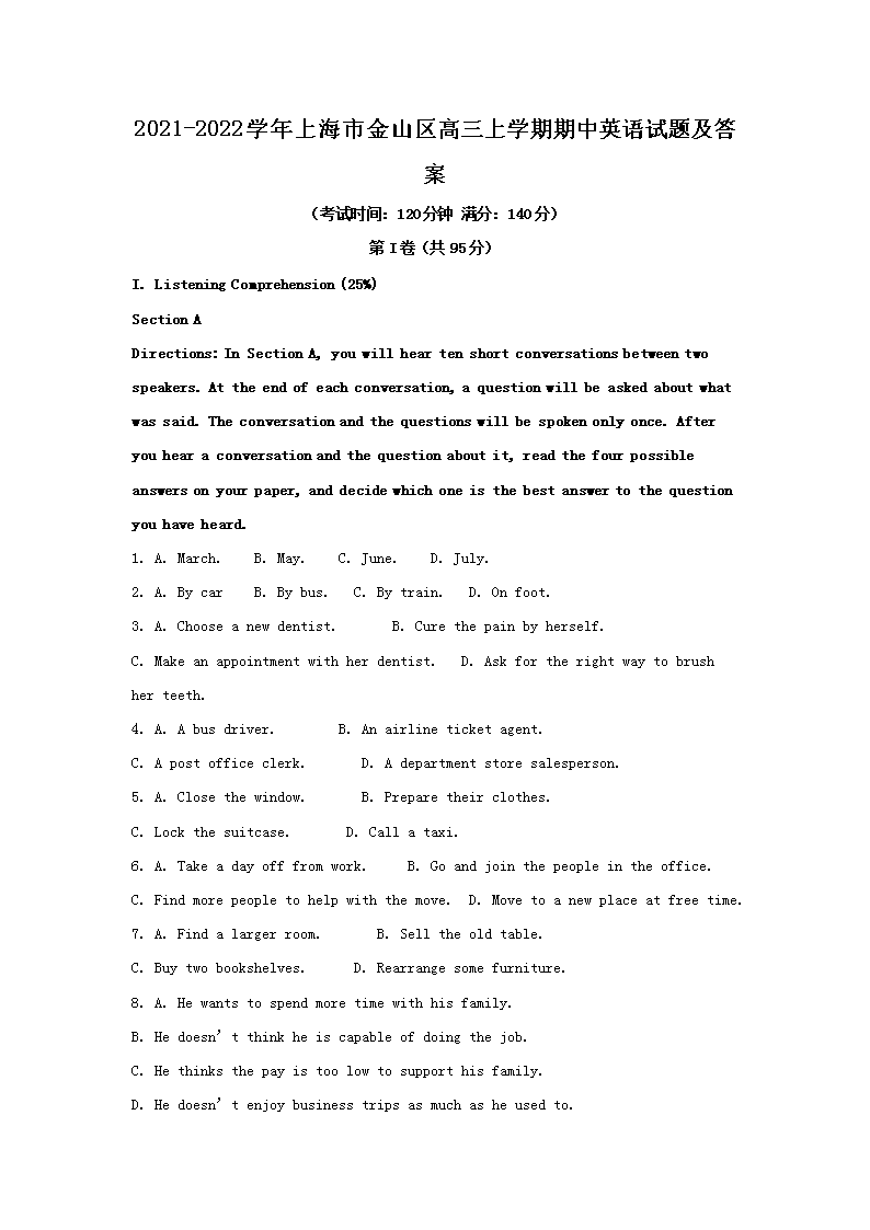 【文档名称】 2021-2022学年上海市金山区高三上学期期中英语试题及答案(Word版).doc