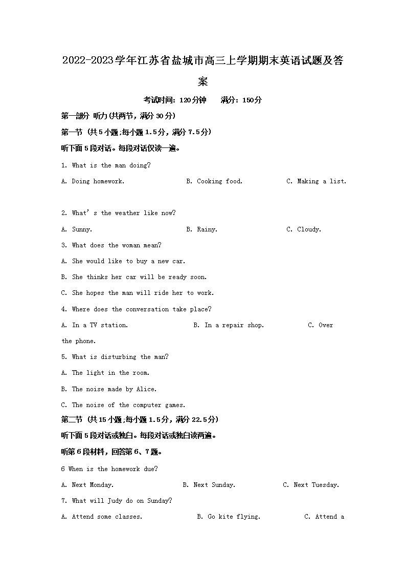 【文档预览】 无忧考网整理发布2022-2023学年江苏省盐城市高三上学期期末英语试题及答案(Word版),前五页预览如下: