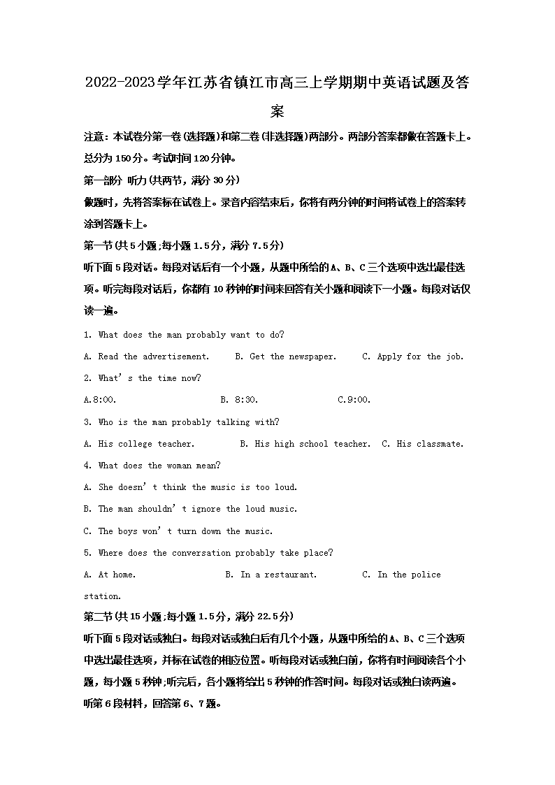 【文档预览】 无忧考网整理发布2022-2023学年江苏省镇江市高三上学期期中英语试题及答案(Word版),前五页预览如下: