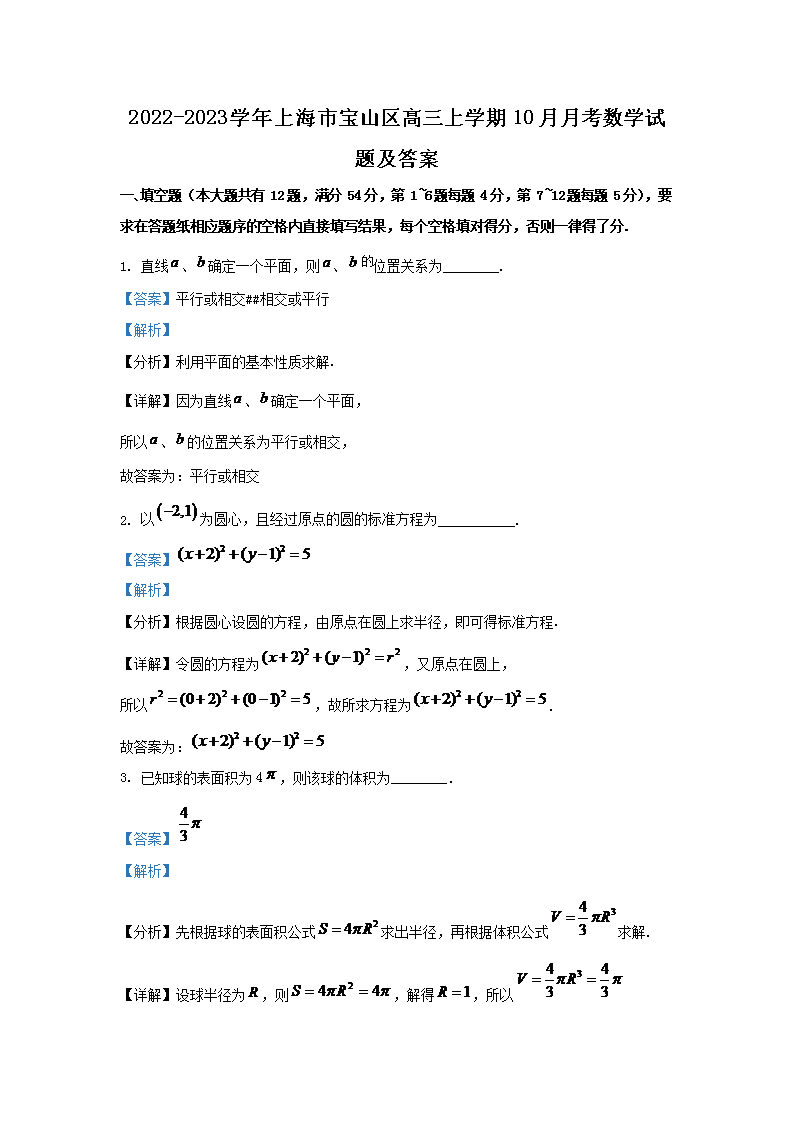 【文档名称】 2022-2023学年上海市宝山区高三上学期10月月考数学试题及答案(Word版).doc