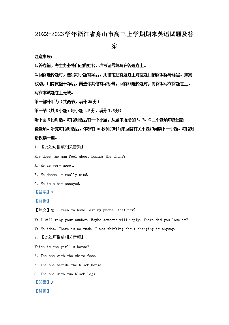 【文档名称】 2022-2023学年浙江省舟山市高三上学期期末英语试题及答案(Word版).doc