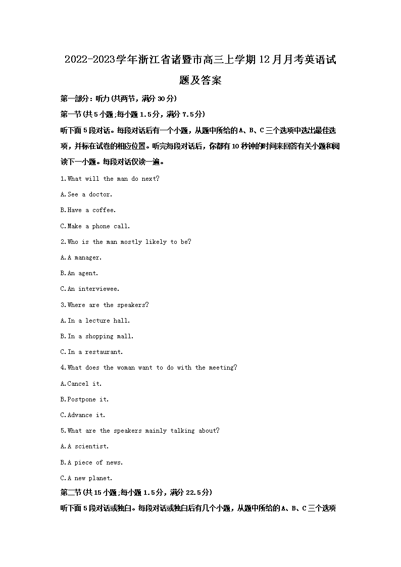 【文档名称】 2022-2023学年浙江省诸暨市高三上学期12月月考英语试题及答案(Word版).doc