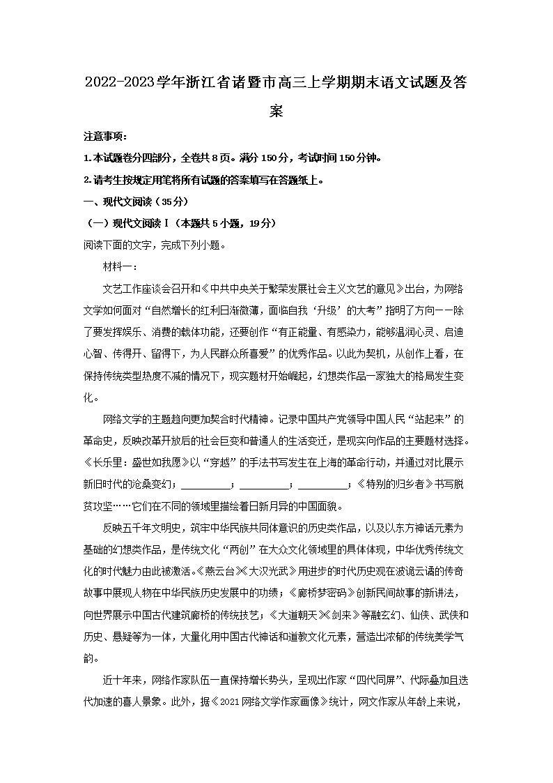 【文档名称】 2022-2023学年浙江省诸暨市高三上学期期末语文试题及答案(Word版).doc