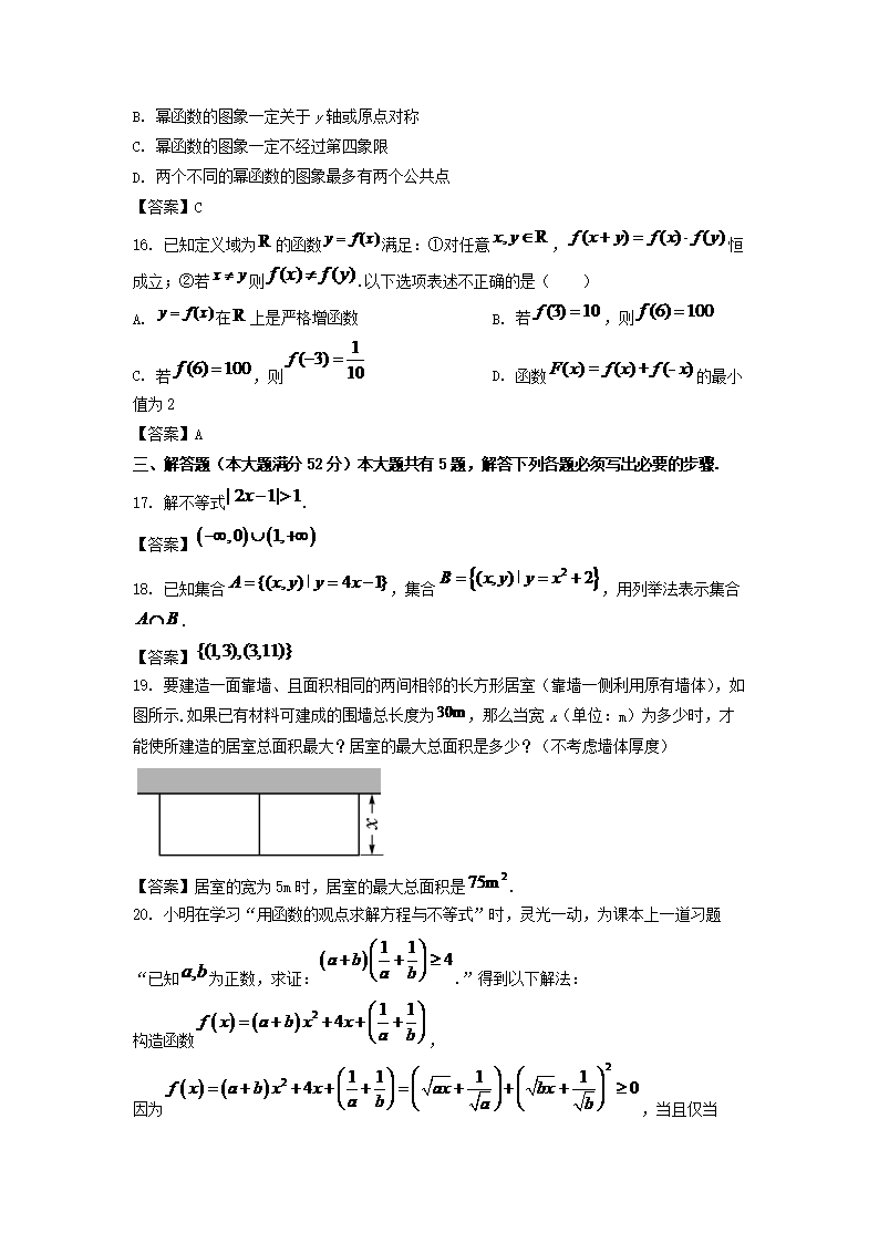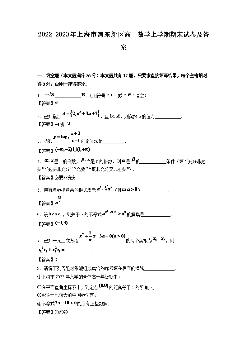 【文档名称】 2022-2023年上海市浦东新区高一数学上学期期末试卷及答案(Word版).doc