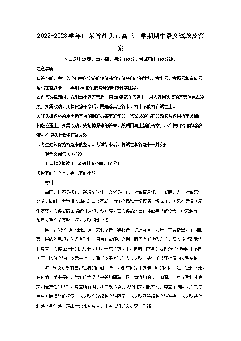 【文档名称】 2022-2023学年广东省汕头市高三上学期期中语文试题及答案(Word版).doc