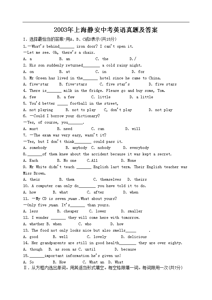 【文档预览】 无忧考网整理发布2003年上海静安中考英语真题及答案(Word版),前五页预览如下: