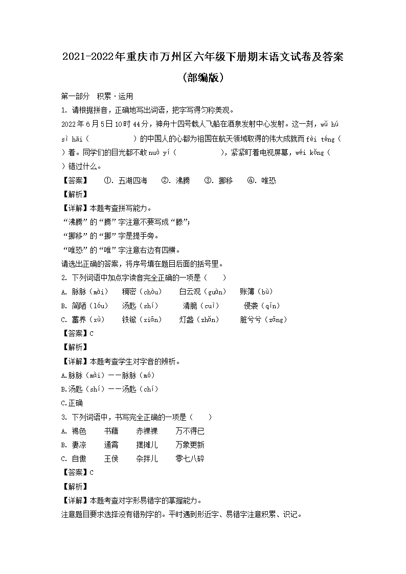 【文档名称】 2021-2022年重庆市万州区六年级下册期末语文试卷及答案(部编版)(Word版).doc